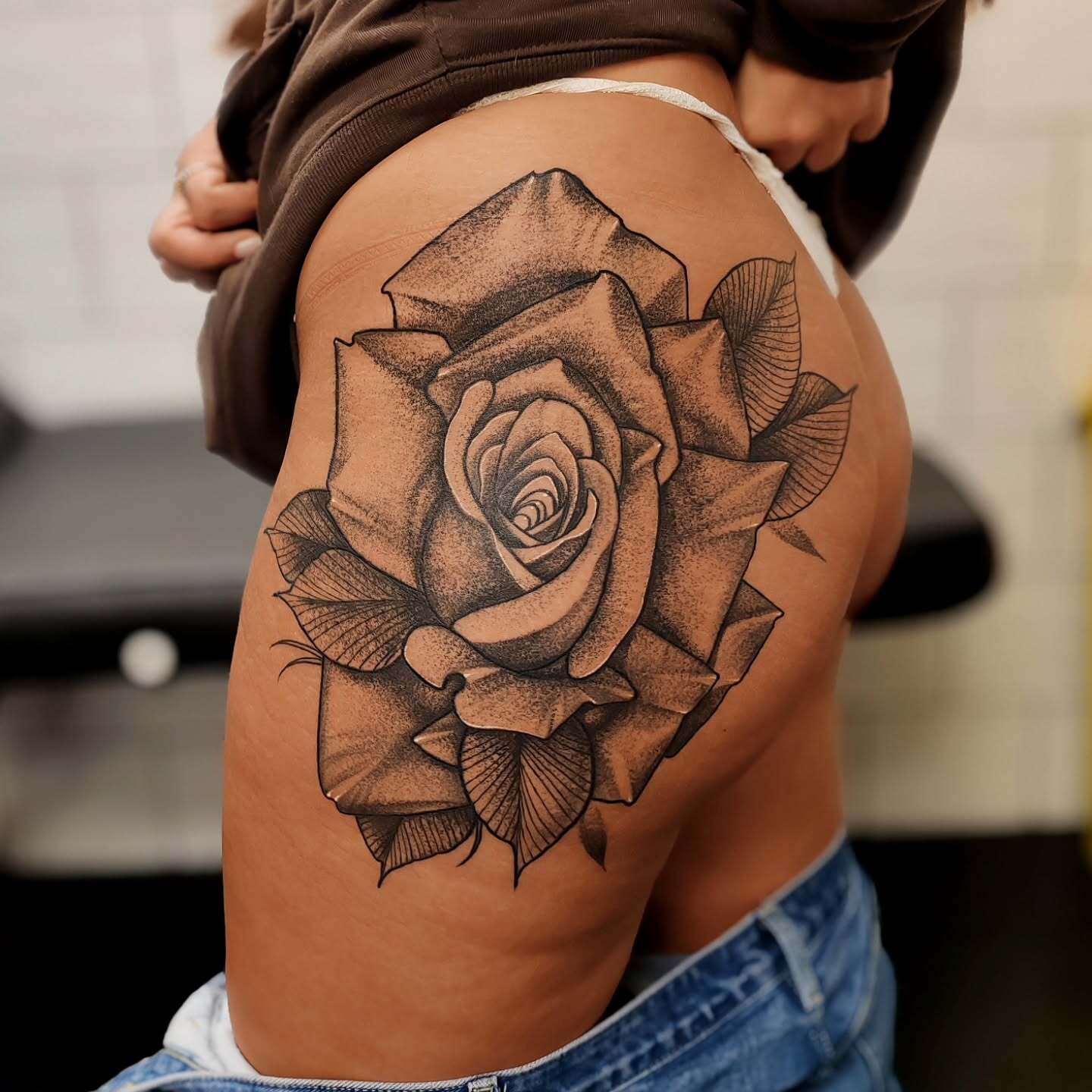 The placement along the hip emphasizes the body’s natural curves, making the design both powerful and elegant. It’s a stunning piece that blends classic floral symbolism with modern tattoo artistry.