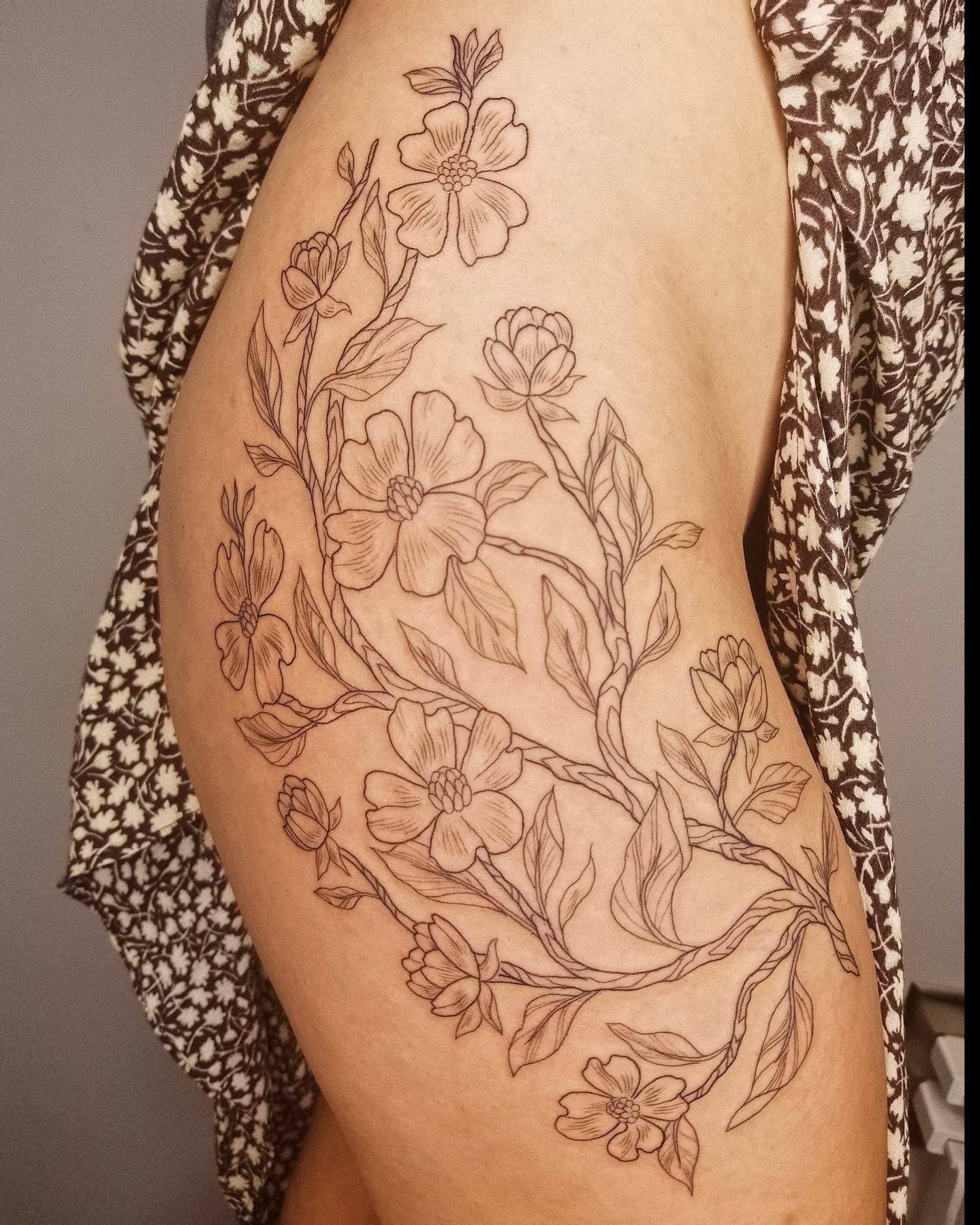 This hip tattoo features an elegant dogwood branch illustrated in fine linework and graceful flow.