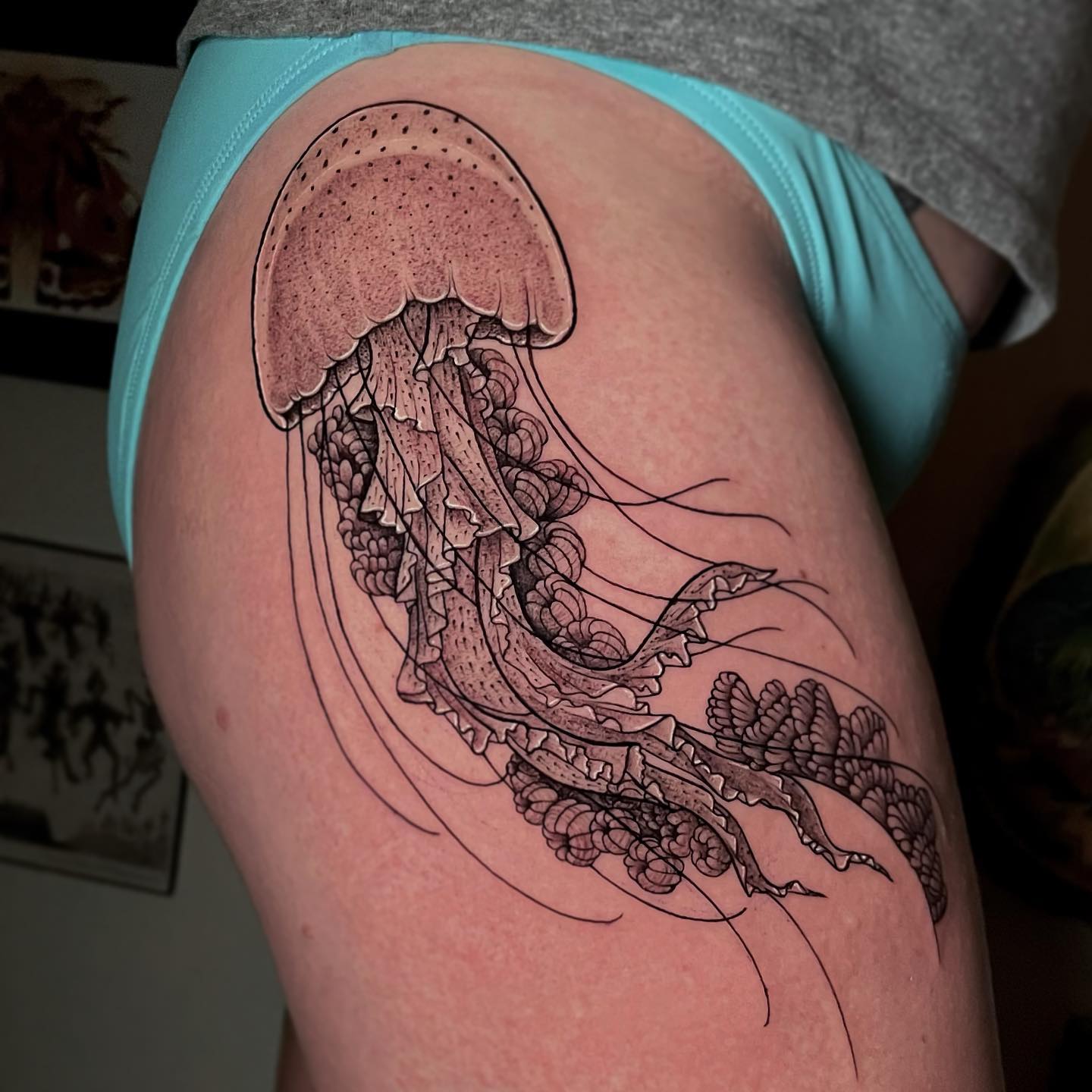 This detailed hip tattoo captures a jellyfish floating gracefully with coral-like textures surrounding its tentacles.