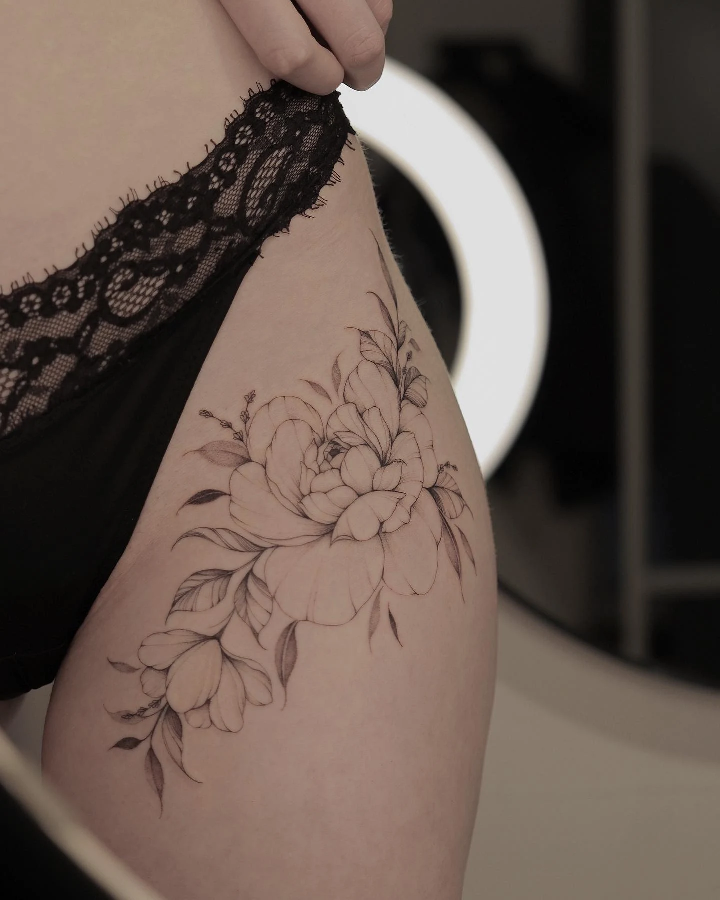 This delicate hip tattoo features a blend of peonies and magnolias, shaded in soft black and gray tones.
