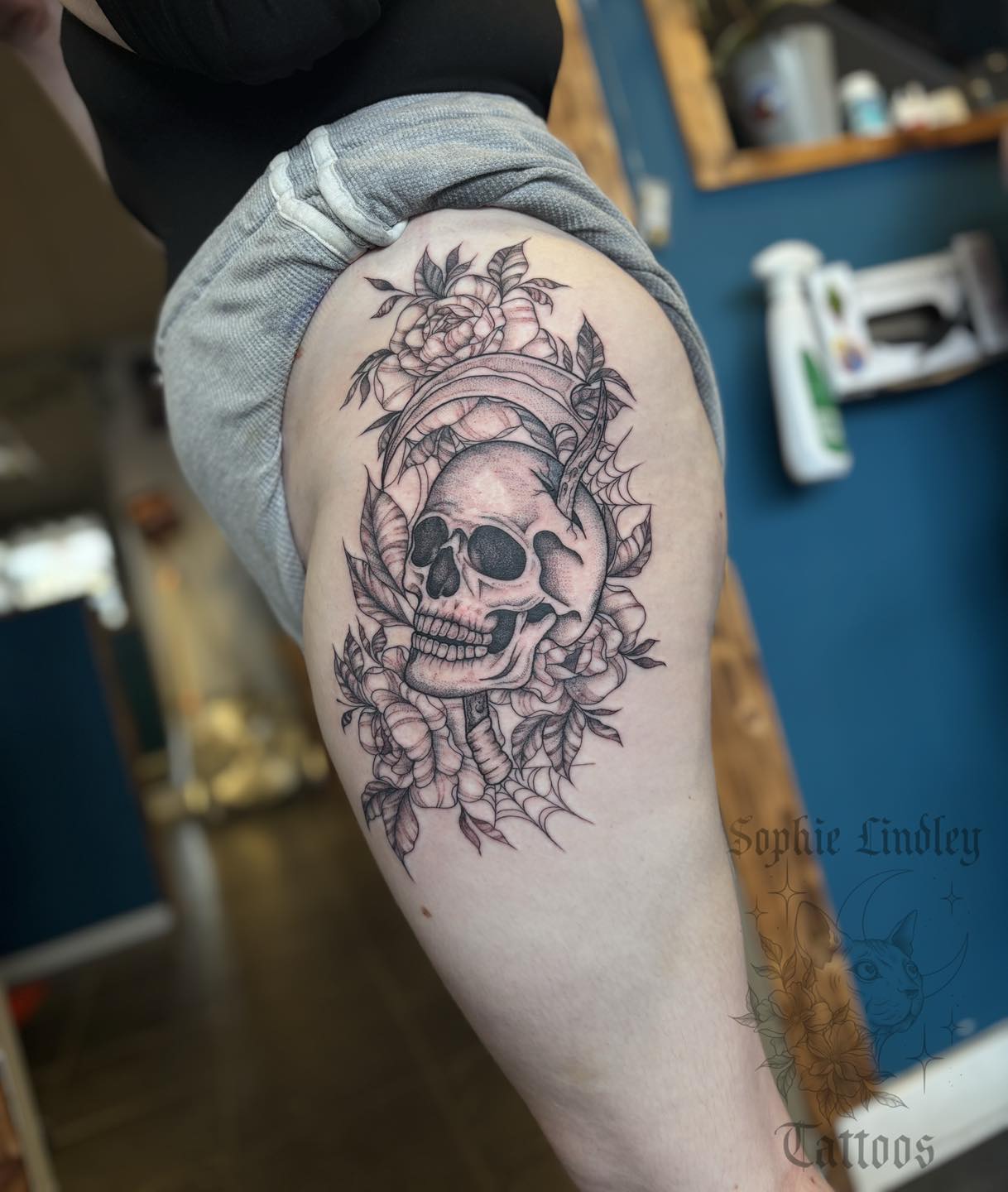 This dramatic hip tattoo combines a realistic skull with blooming roses, leaves, and a curved scythe-like element.