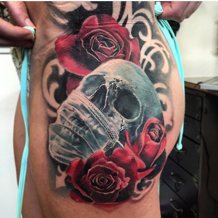 This dramatic hip tattoo features a skull wearing a surgical mask surrounded by deep red roses.