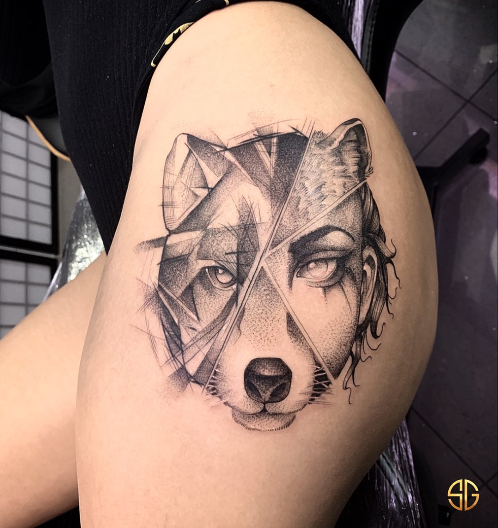 It shows a wolf and a woman’s face merging through angular shapes that create a fractured, mirror-like effect.