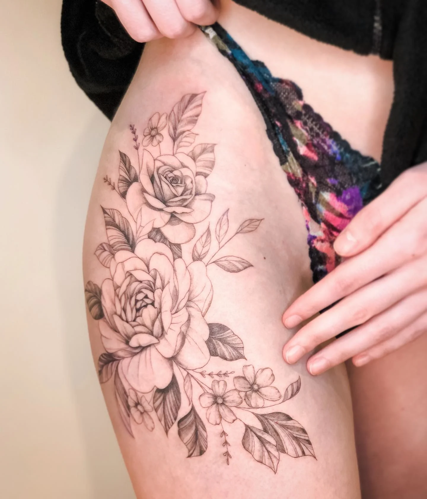 The open blossoms and detailed leaves move harmoniously across the hip, enhancing the body’s shape.