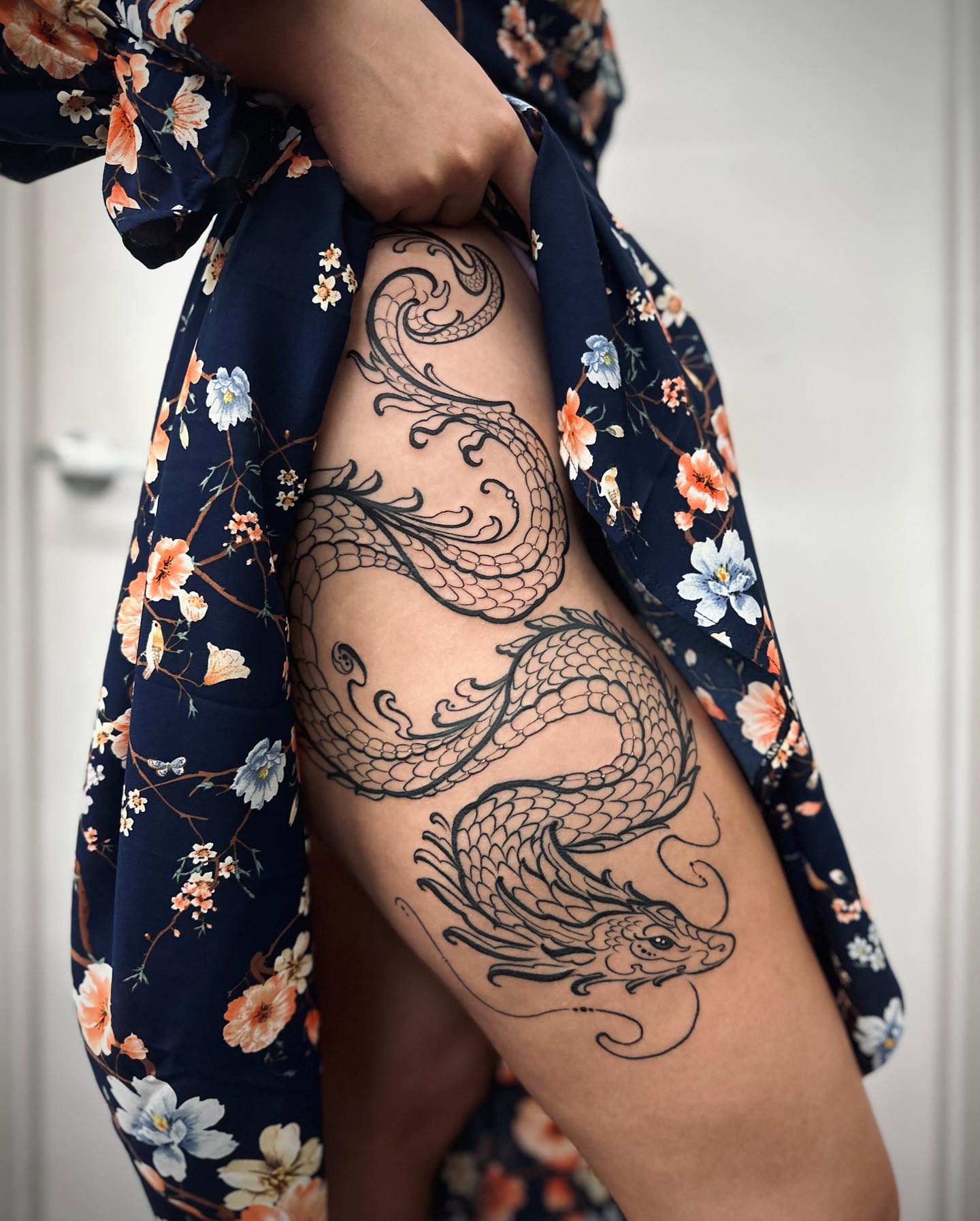The dragon’s body curves elegantly along the hip and thigh, creating a sense of motion and power.