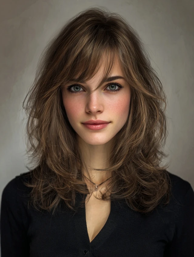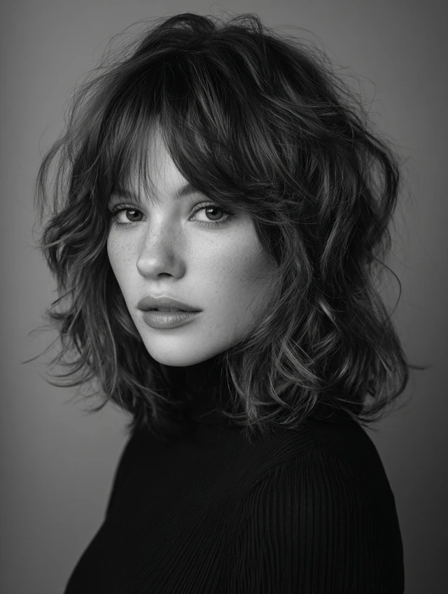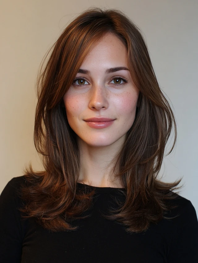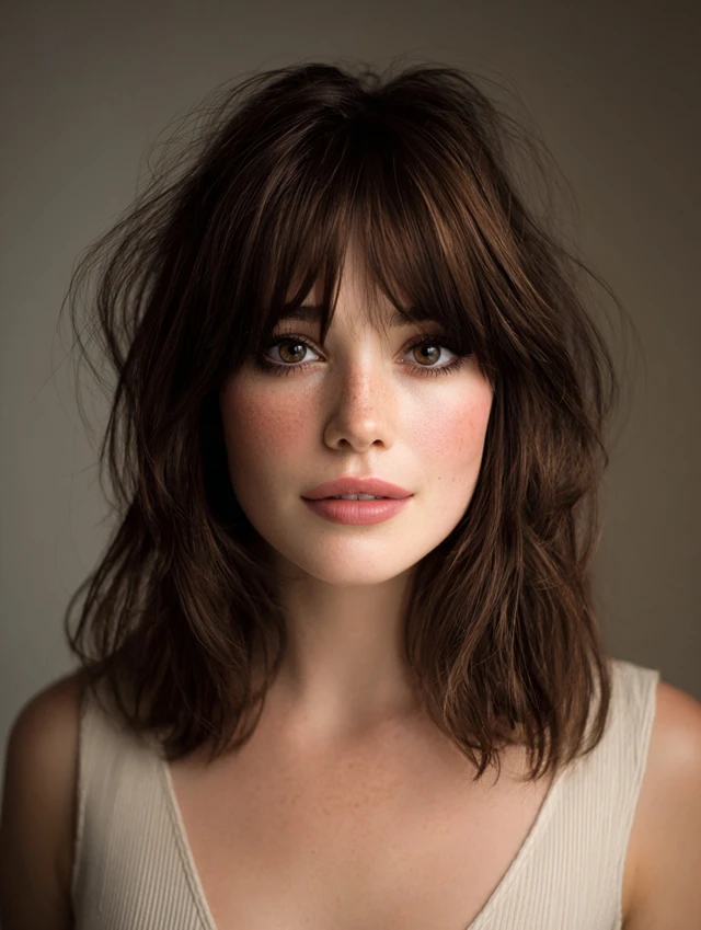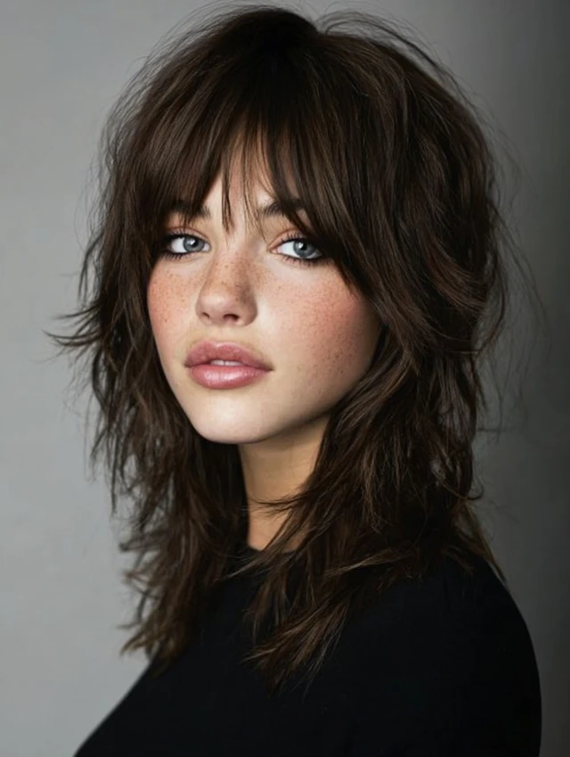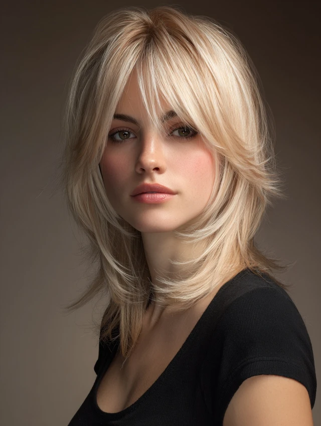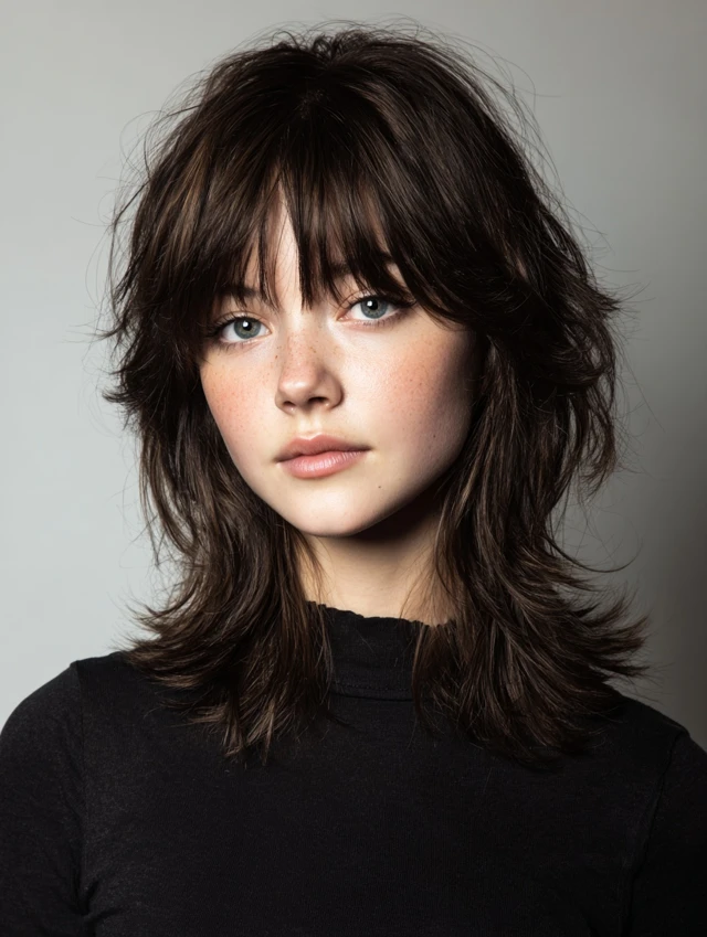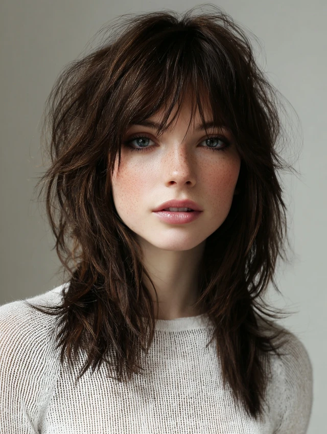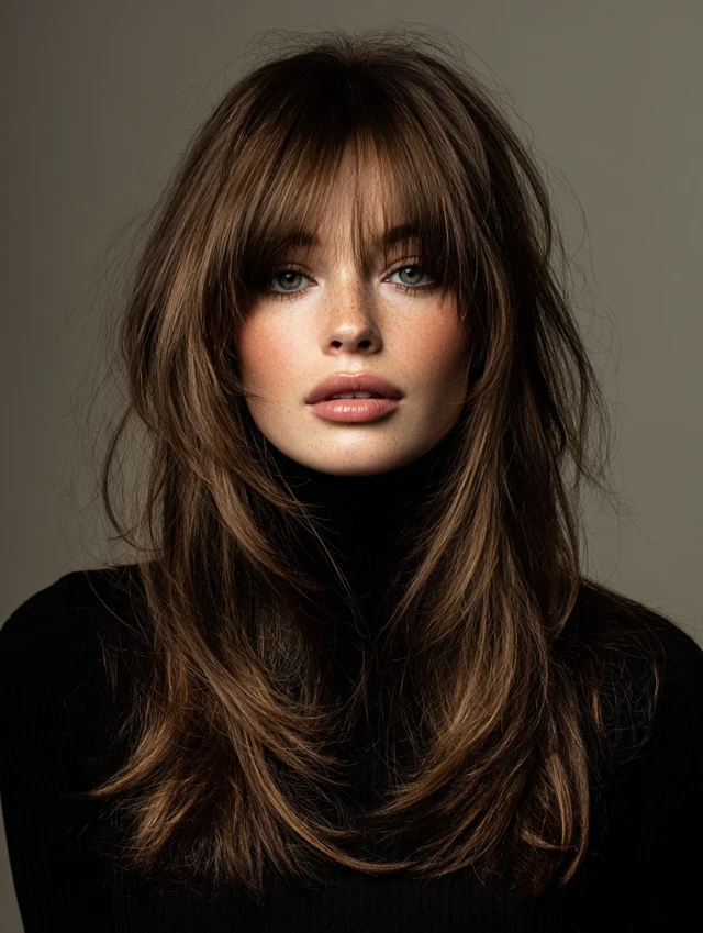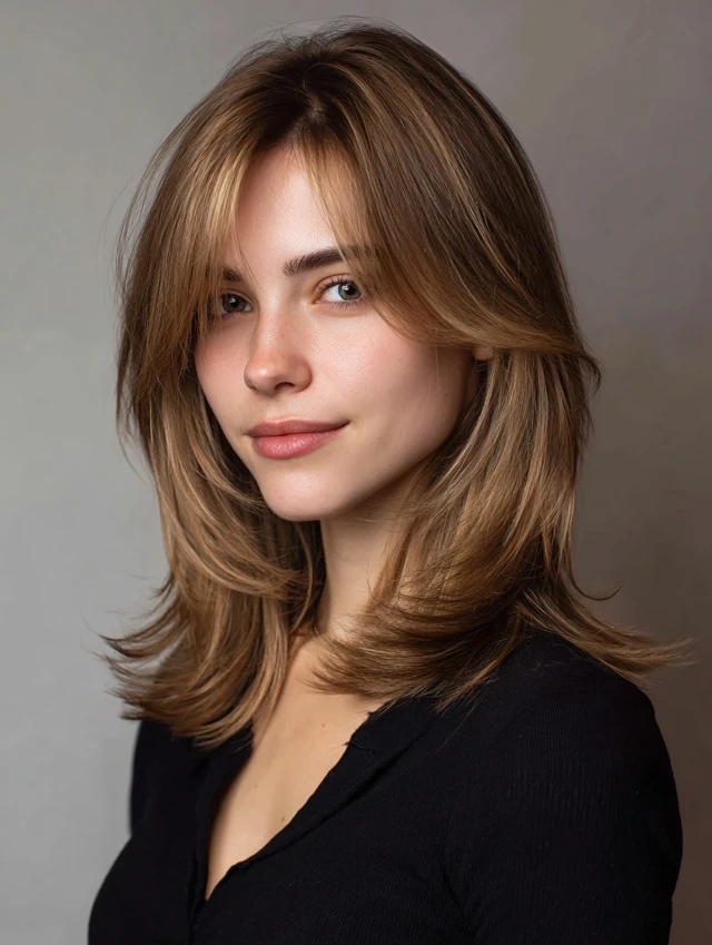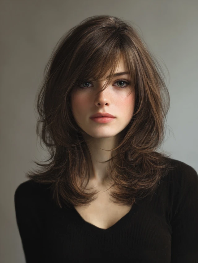 Adding wispy bangs enhances the cat-like aesthetic and draws attention to the eyes. The bangs blend into the layers, softening the forehead. This works for round, oval, and heart-shaped faces. Medium to fine hair textures benefit most, as bangs keep the look light and airy.