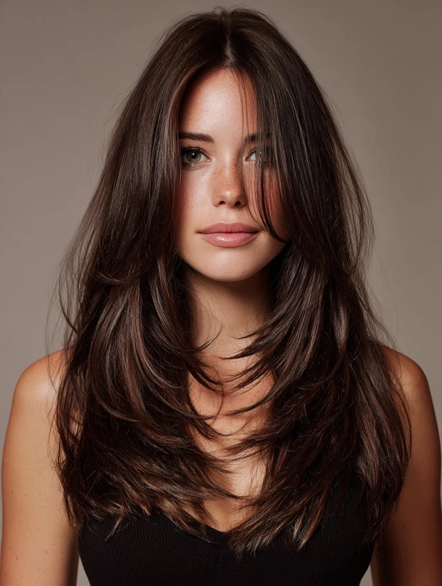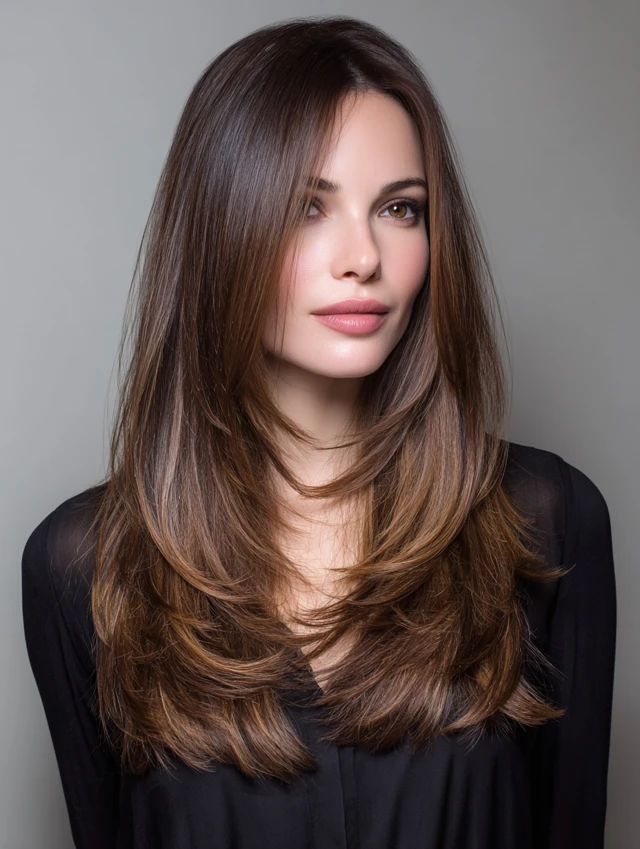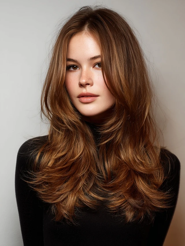 The long kitty cut preserves length while integrating soft, pointed layers and subtle bangs. It works well for thick, wavy, or straight hair. Oval, round, and heart-shaped faces benefit from the length, which softens strong features and adds dimension.
