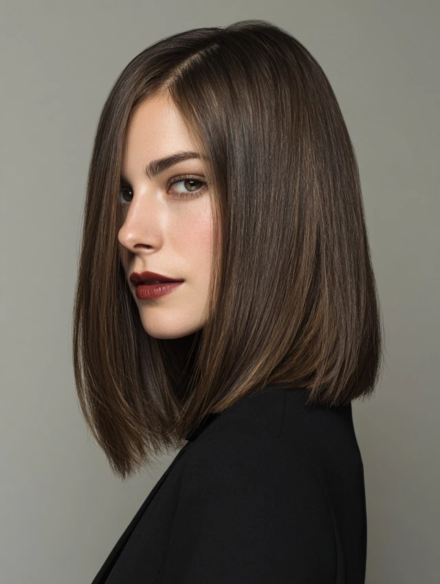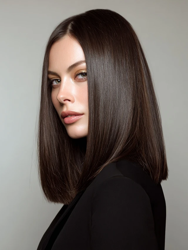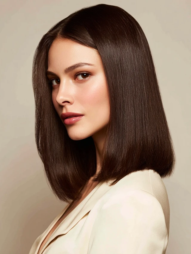 Oval, square, and round faces suit this style. Works best on straight or slightly wavy thick hair. Ideal for professional or formal occasions. Use a smoothing serum and flat iron to achieve a glossy, sleek finish.