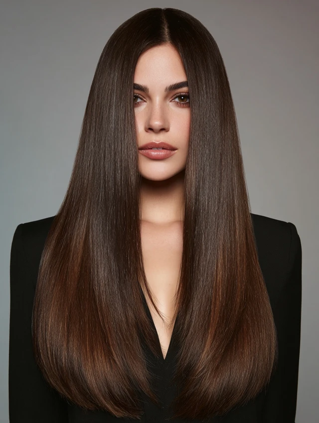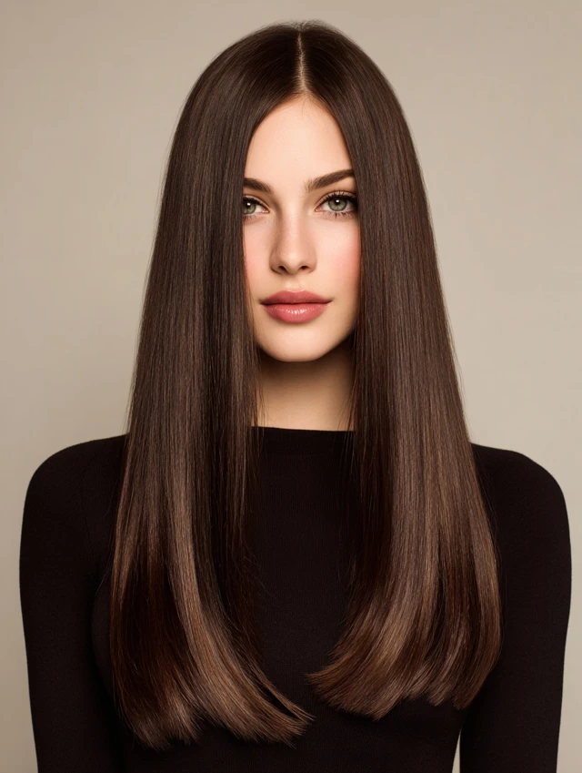 Sleek, straight long hair emphasizes the natural symmetry of an oval face. Keeping hair smooth and shiny draws attention to balanced features. This style works for both professional and formal occasions.