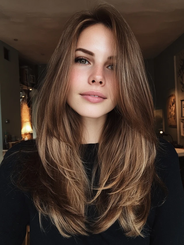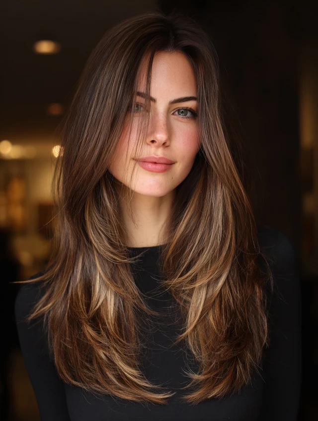Face-framing layers subtly sculpt the hair around the cheeks and jawline. They add softness and depth while highlighting the natural balance of an oval face. This style keeps hair voluminous without extra bulk.