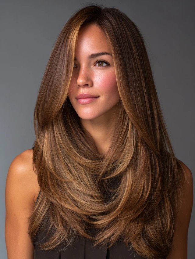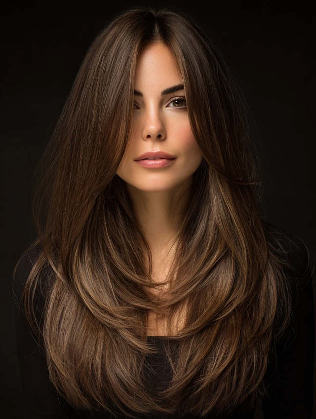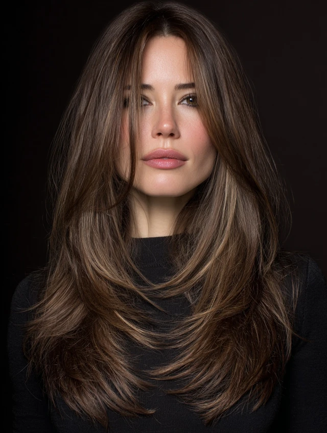 Long layered hair paired with subtle highlights enhances dimension and depth. Face-framing layers work with color to accentuate features.