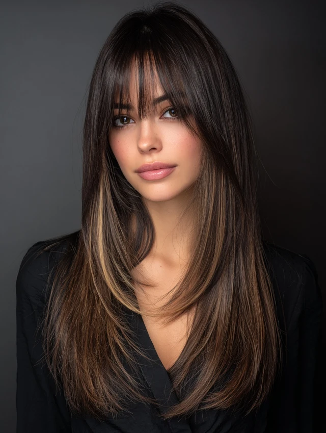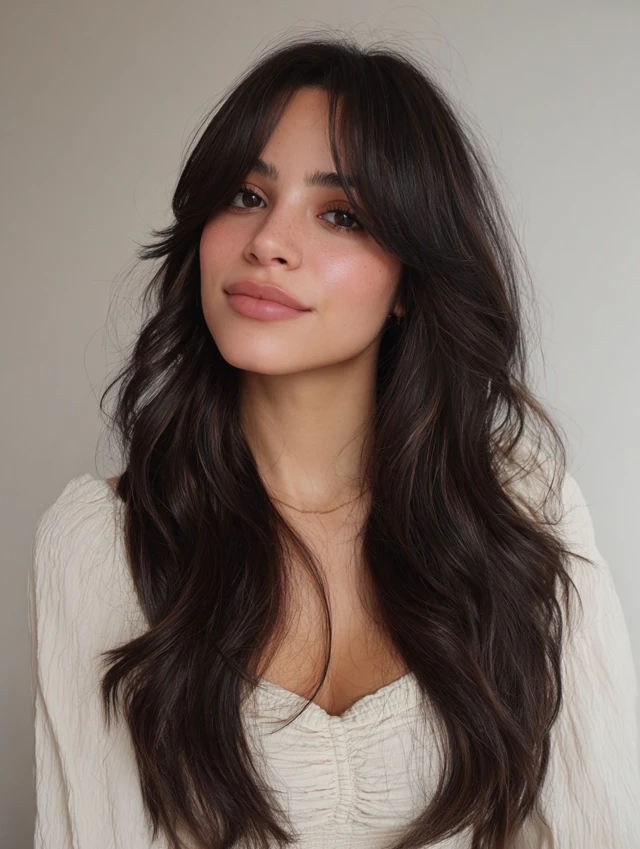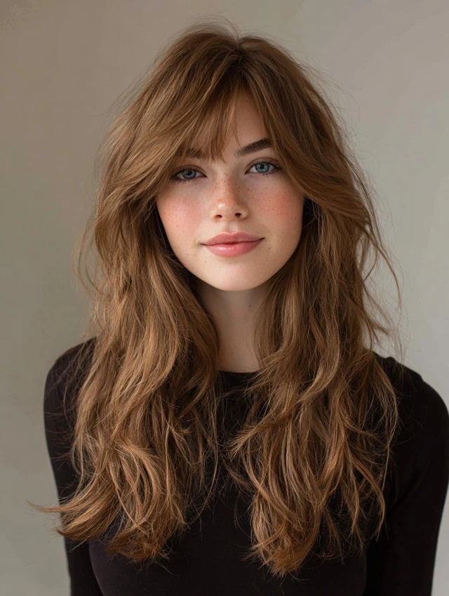 Curtain bangs with layered long hair create a romantic, flattering frame around the face. Layers soften angles and add volume without removing length.