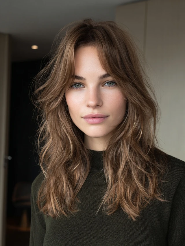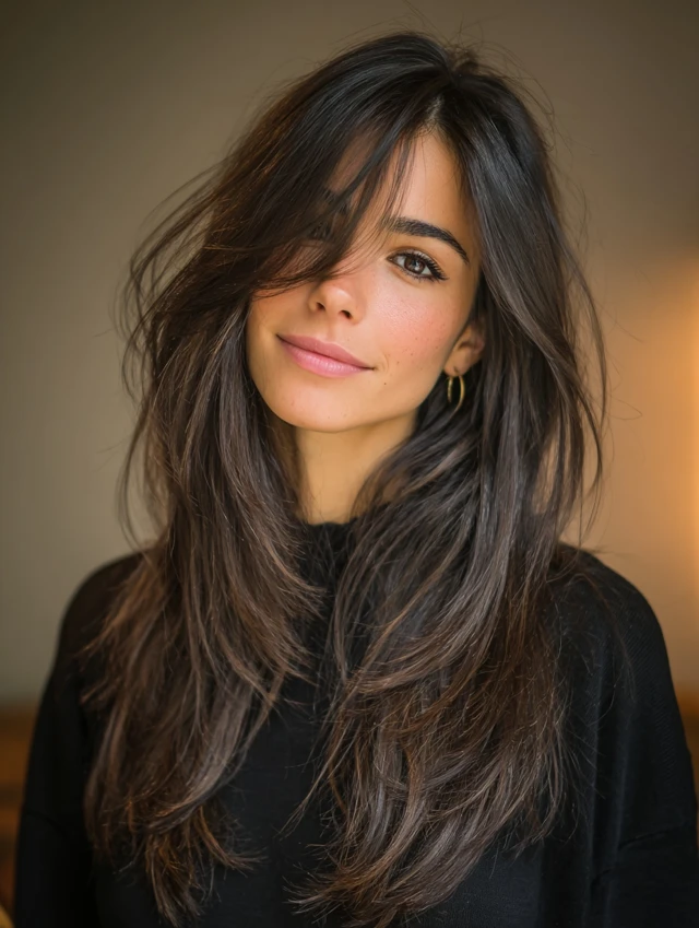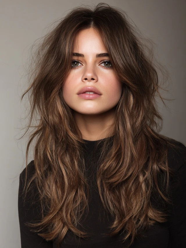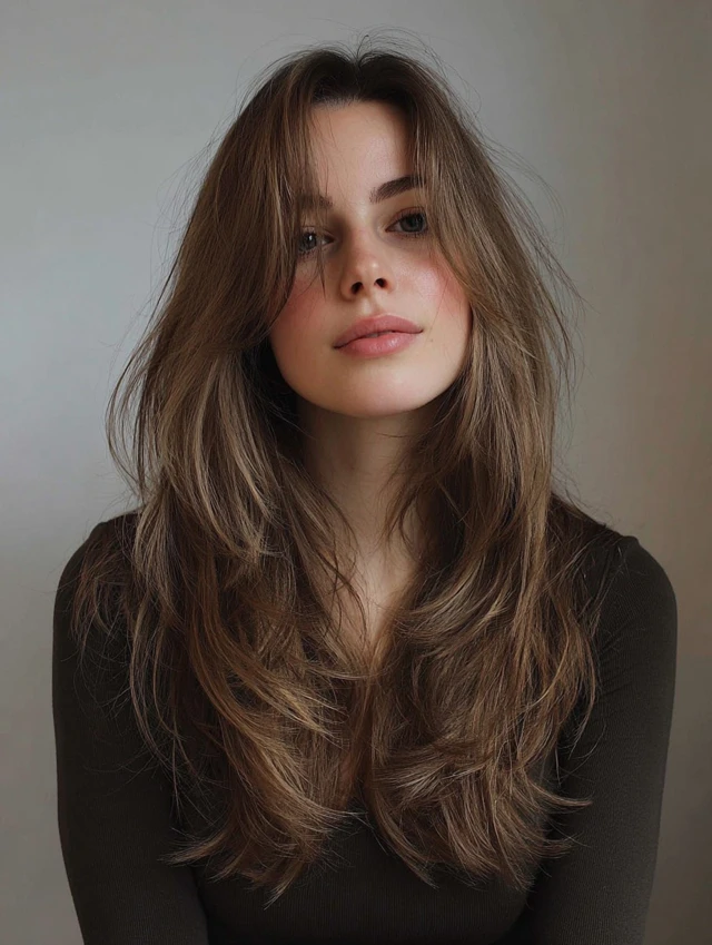 A side part with tousled long layers adds effortless volume and natural movement. Face-framing pieces soften facial features and highlight jawlines.
