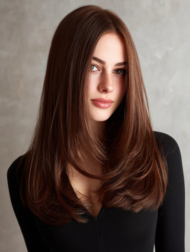 Straight hair with subtle face-framing layers gives sleek elegance while maintaining length. The layers add lightness at the ends and around the face.
