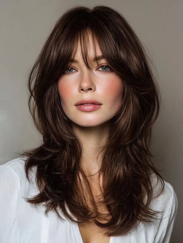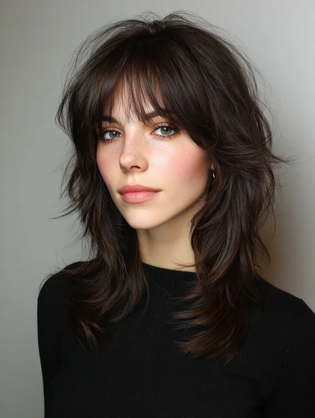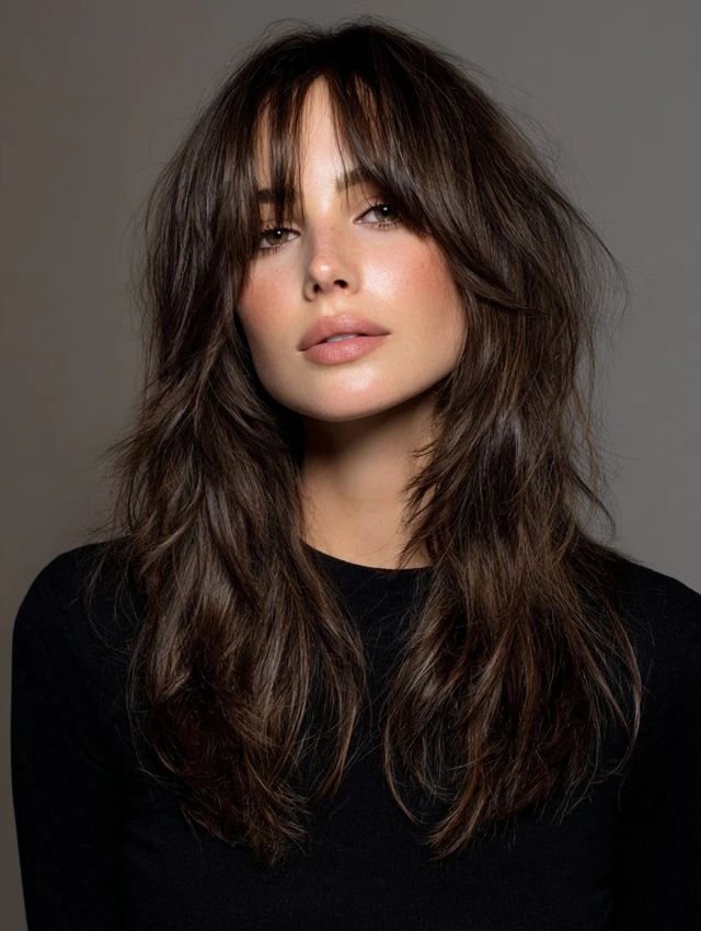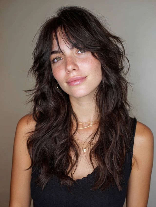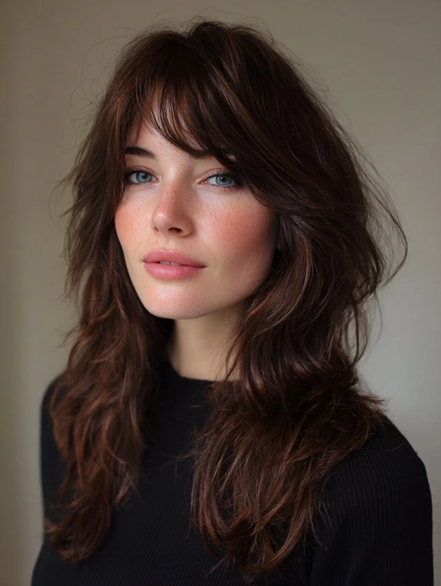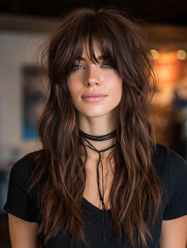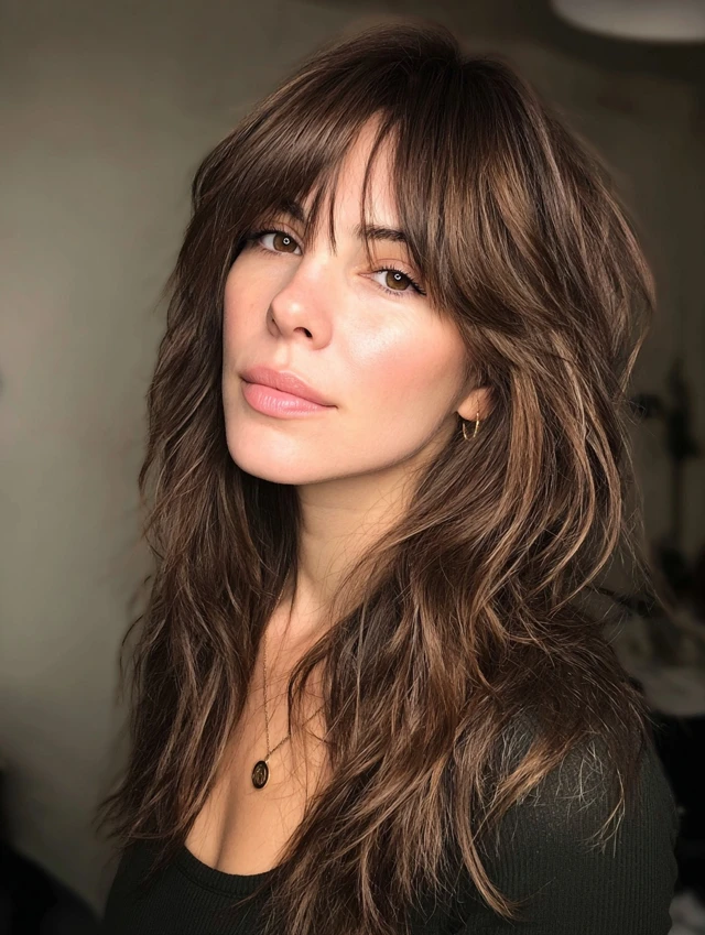 Side-swept bangs in a long shag add softness and dimension. The layers throughout maintain movement, while bangs balance facial features and create a flattering, romantic frame.