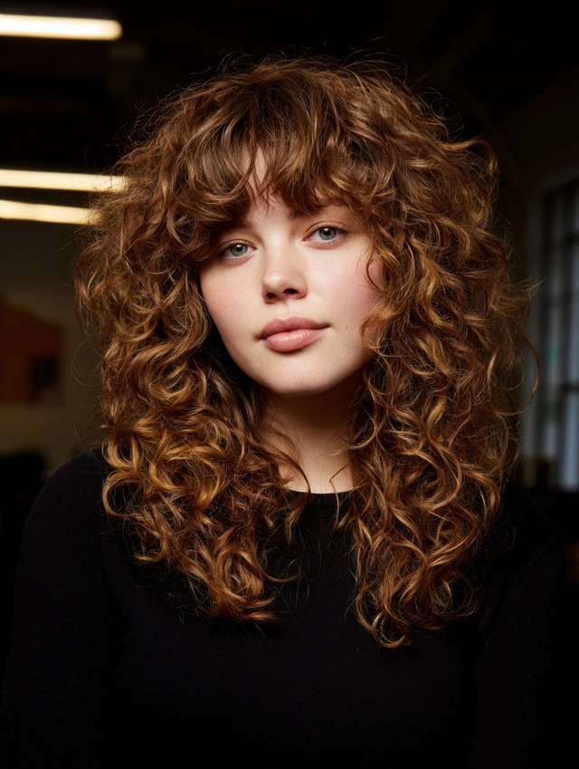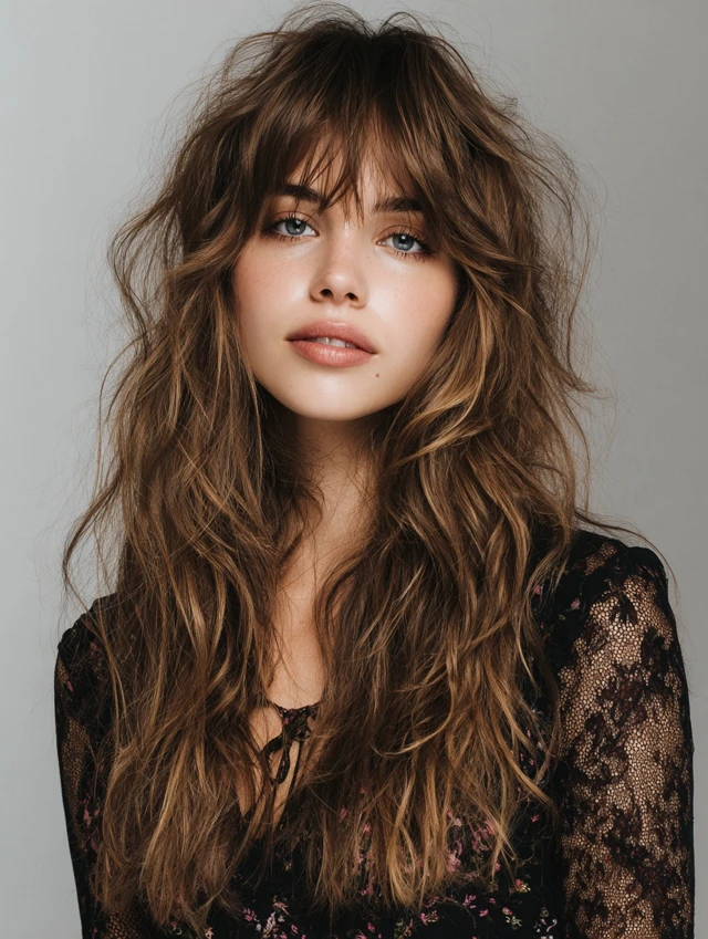 A textured long shag with curtain bangs frames the face while adding movement. Layers throughout prevent flatness and enhance natural waves or curls. Curtain bangs soften the forehead and balance facial features.