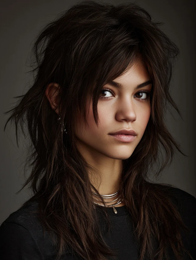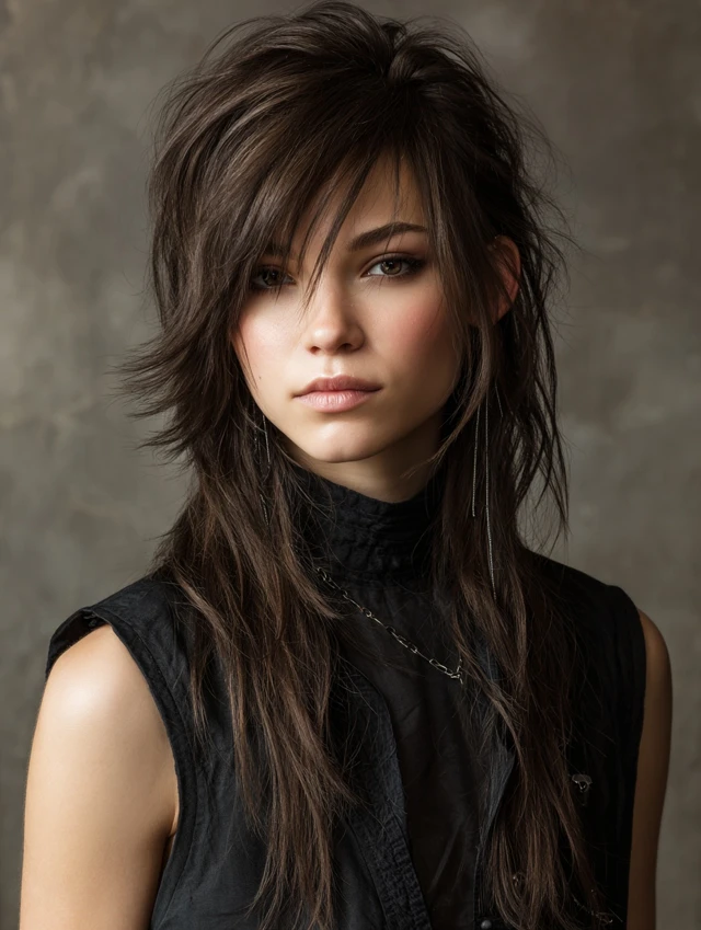 The classic long wolf cut features long, layered ends with shorter, choppy layers at the crown. It works well for oval, round, and heart-shaped faces. Medium to thick hair holds layers and volume naturally.