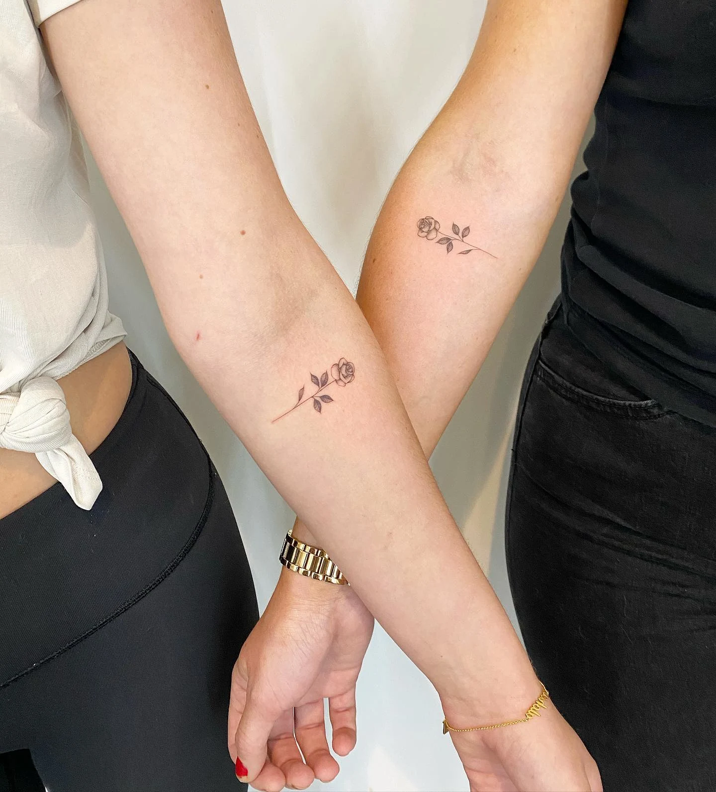 The rose stem flows naturally through the design, creating an elegant and balanced look on each friend’s arm.