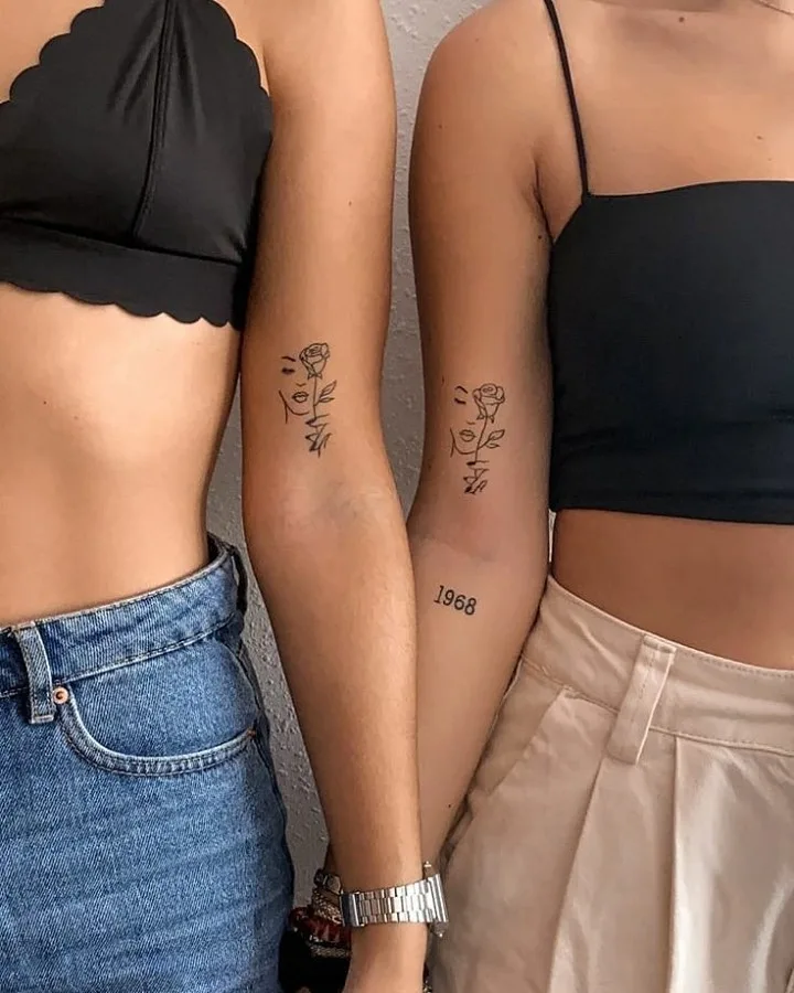 These matching tattoos show a minimalist face drawn with a single continuous line, beautifully paired with a blooming rose.