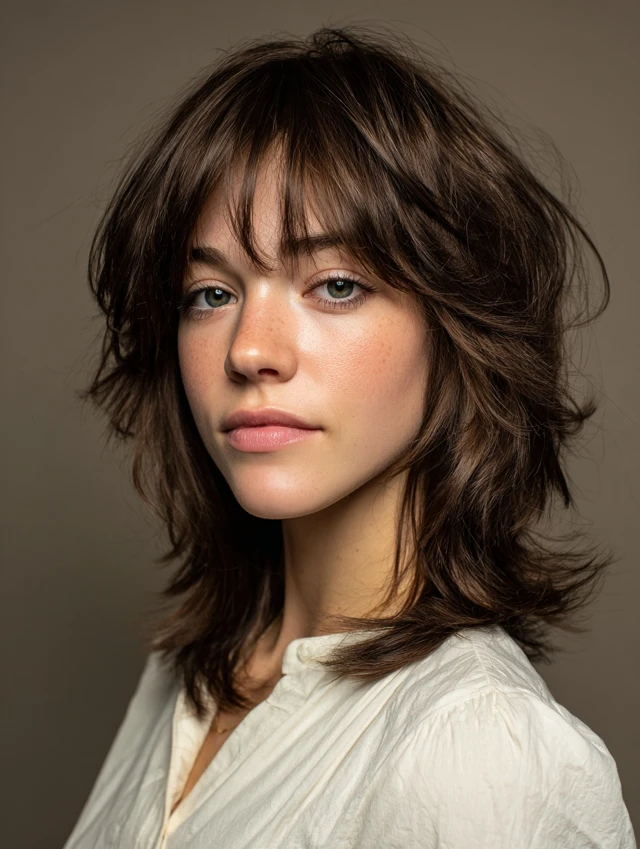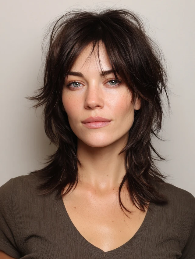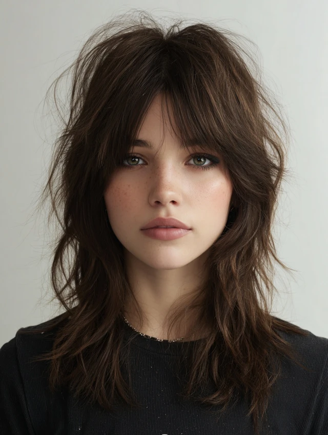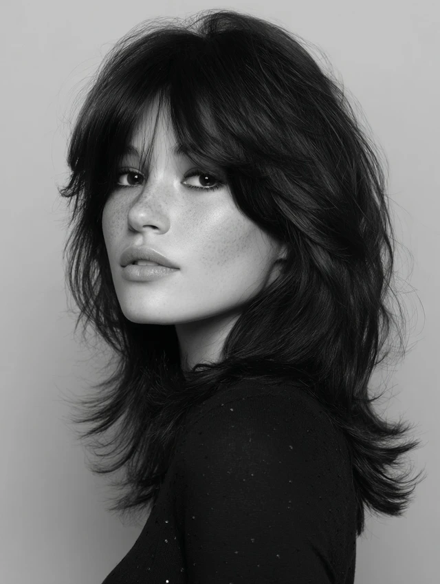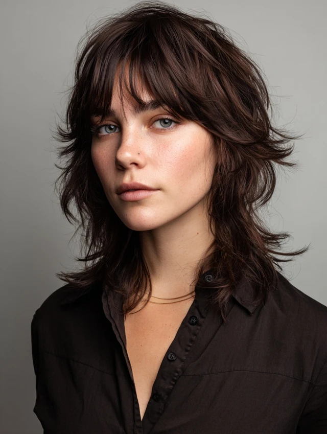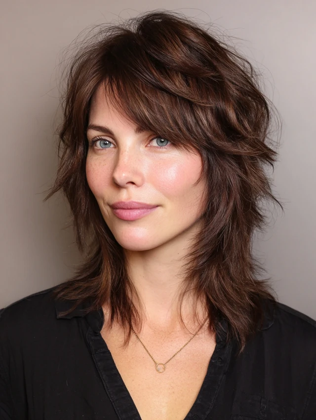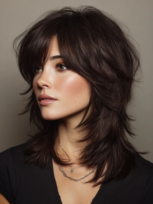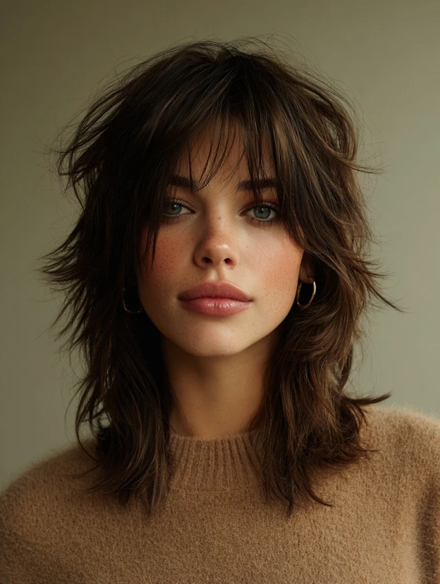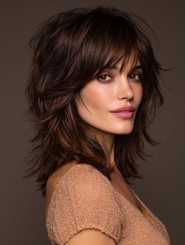 Medium shag haircuts feature layered, textured lengths that fall around the shoulders, creating movement and volume without extreme shortness. They work for straight, wavy, or lightly curly hair and suit medium to thick textures best. This length is flattering for oval, round, and heart-shaped faces because it softens angles while maintaining edge. Medium shags are versatile, offering both casual, tousled styles and polished, professional looks. They’re easy to style with minimal effort, making them perfect for busy lifestyles or low-maintenance routines.