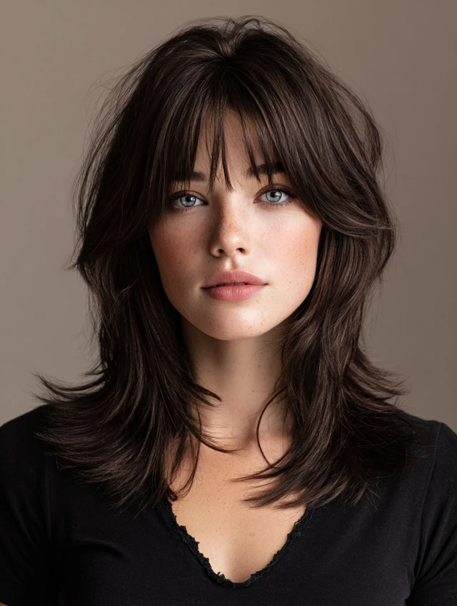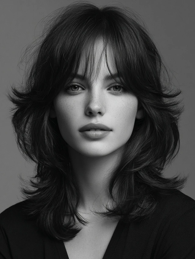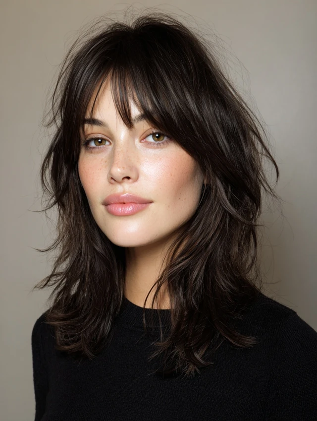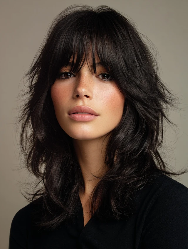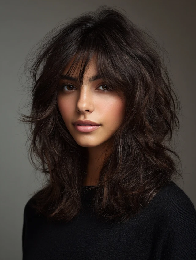 Medium shags with bangs soften the forehead and frame the face, adding personality and style. Works well for oval, round, and square faces. Straight, wavy, or slightly curly hair benefits most.