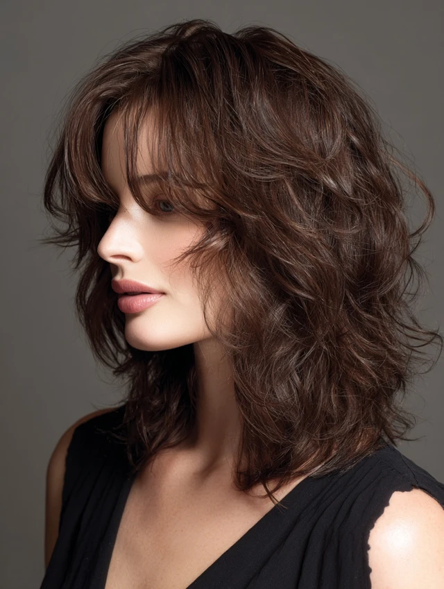 Wavy medium shags enhance natural waves, adding texture and volume. Works best for oval and square faces. Medium to thick wavy hair holds layers while highlighting movement.