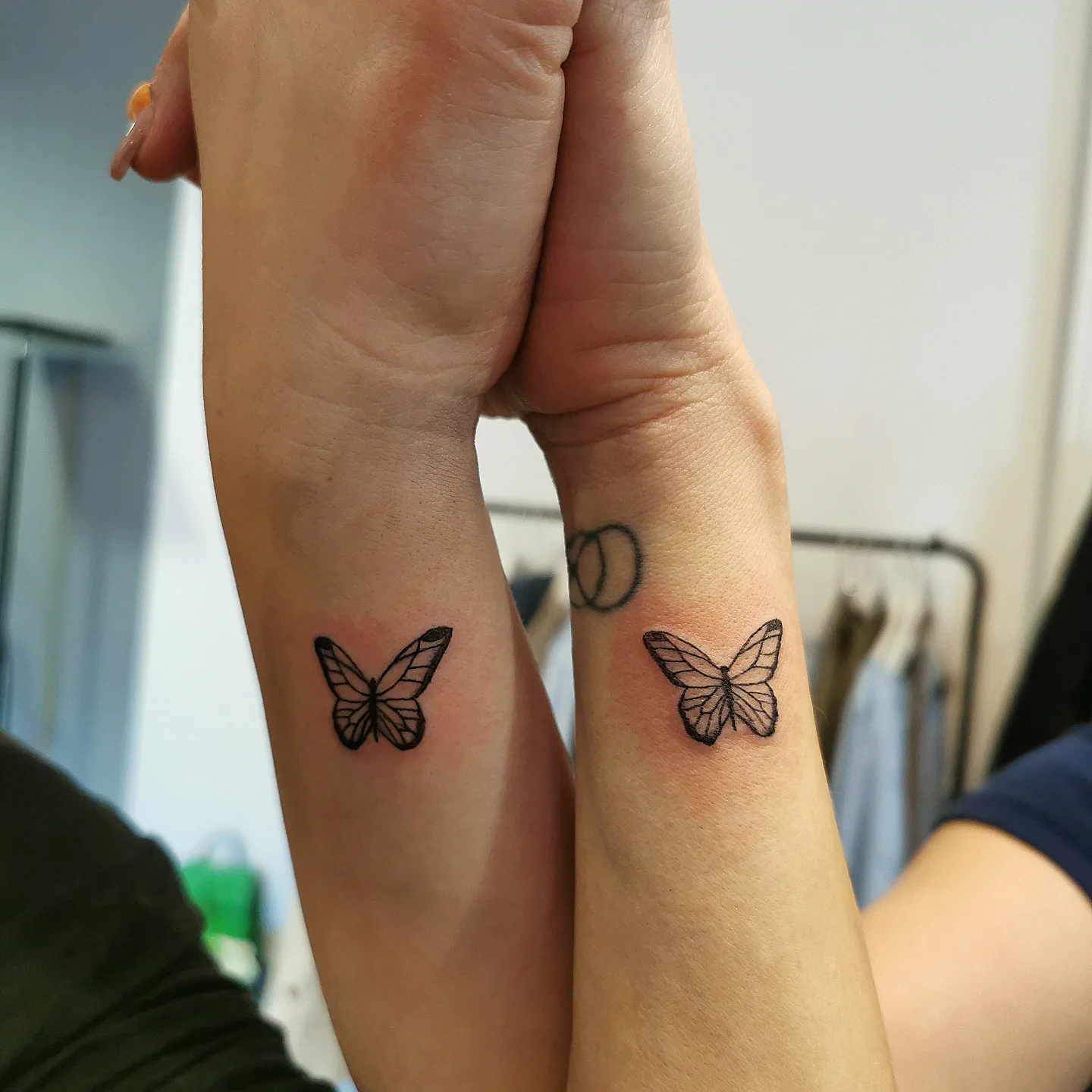 Clean linework gives the tattoo a soft, timeless feel that ages well. Wrist placement keeps the design personal and easy to see every day. Together, these matching butterflies reflect a bond built on love, freedom, and constant connection.