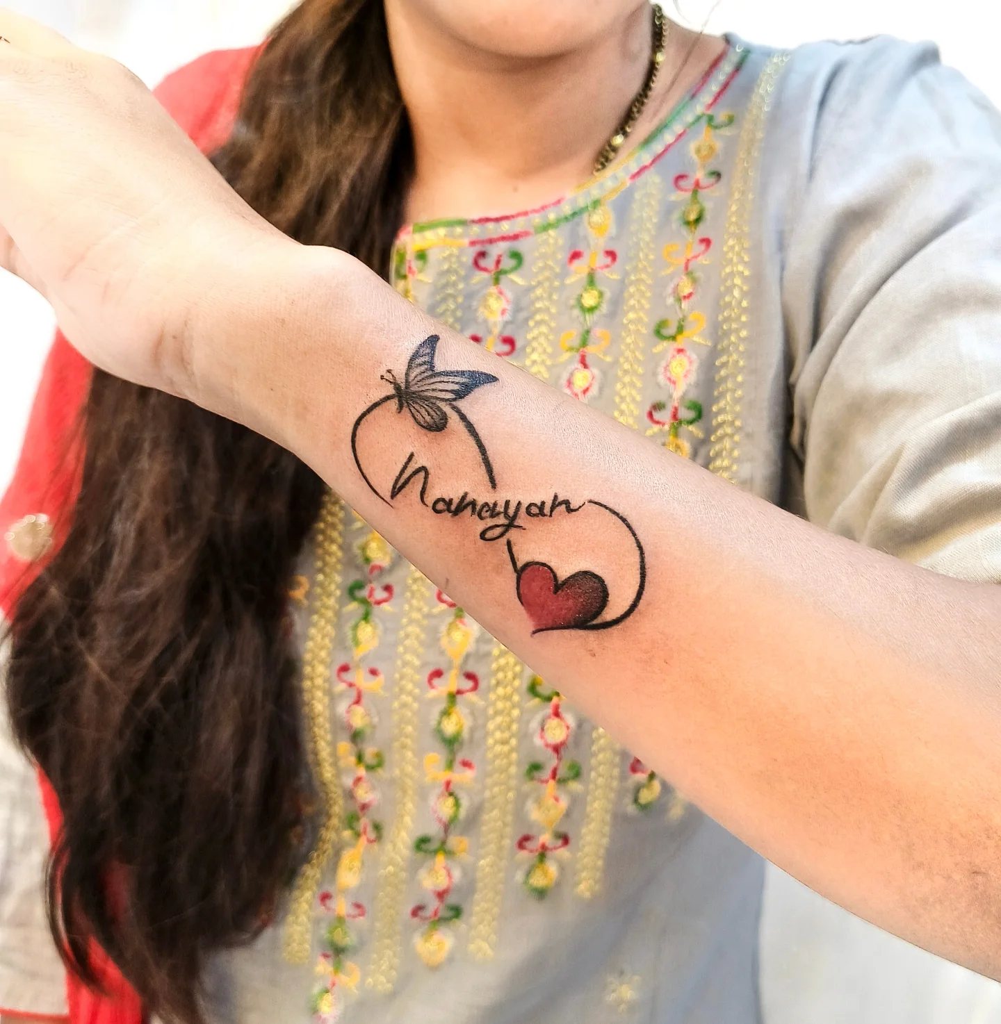 This Nanayah name tattoo combines soft script lettering with a butterfly and heart for a warm, feminine design. Placed along the inner forearm, the tattoo follows the arm’s natural curve and feels beautifully balanced. The flowing line connects the butterfly to the heart, creating movement and a sense of continuity.