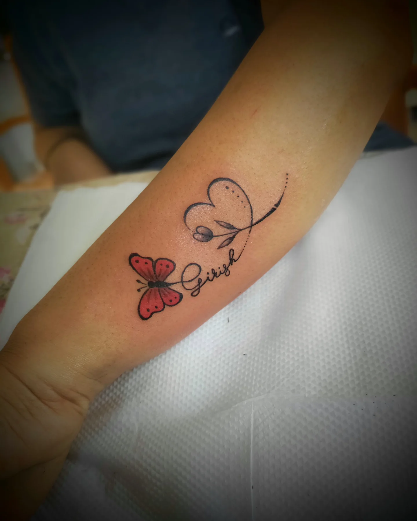 This Girish name tattoo blends soft symbolism with clean linework for a gentle, feminine look. The name flows in delicate script along the inner forearm, keeping the design personal and easy to admire. A heart shaped line extends upward, creating movement and balance, while the butterfly adds a graceful, uplifting touch.