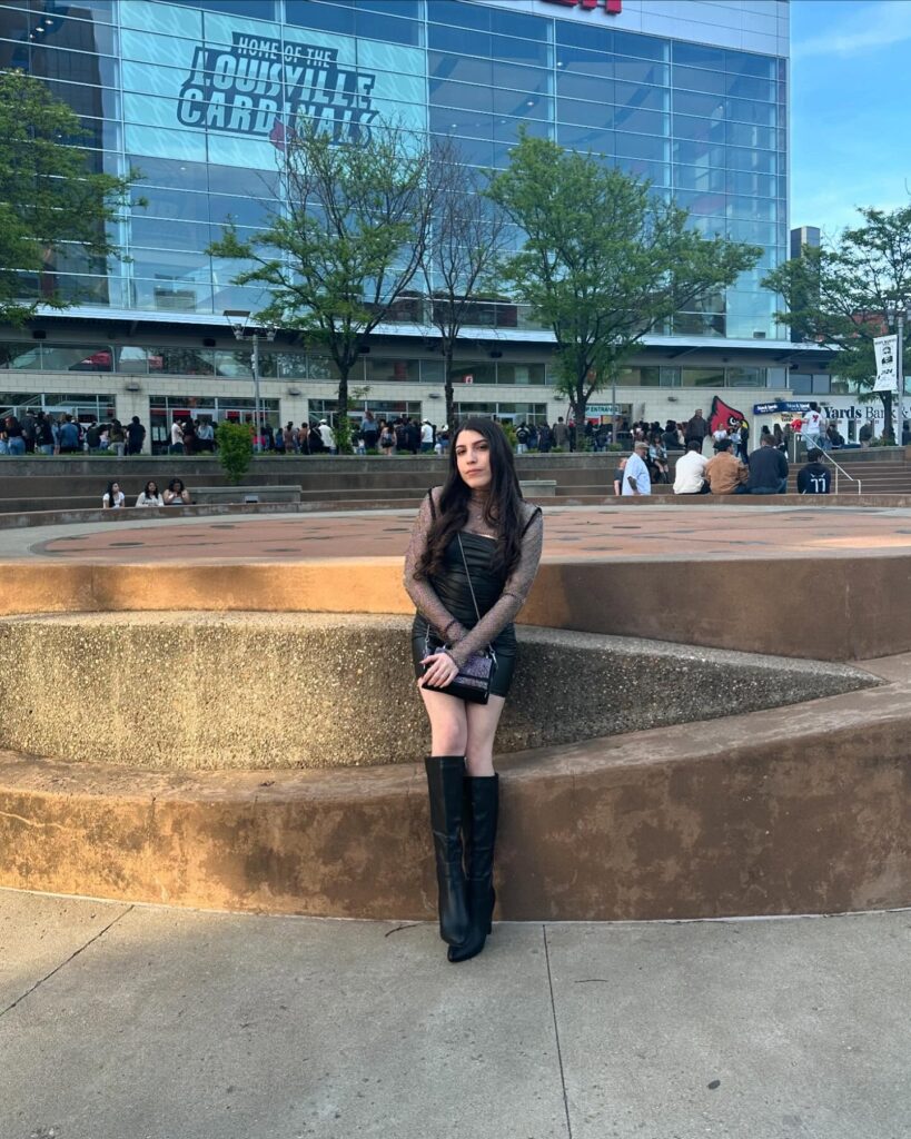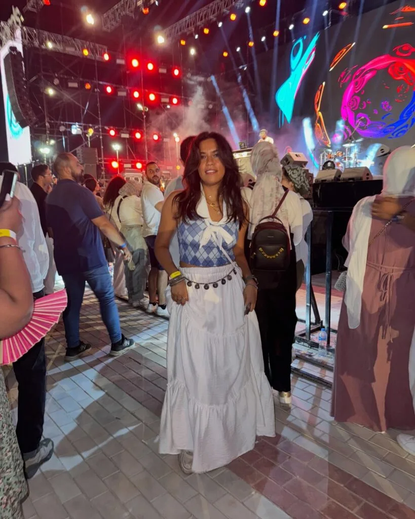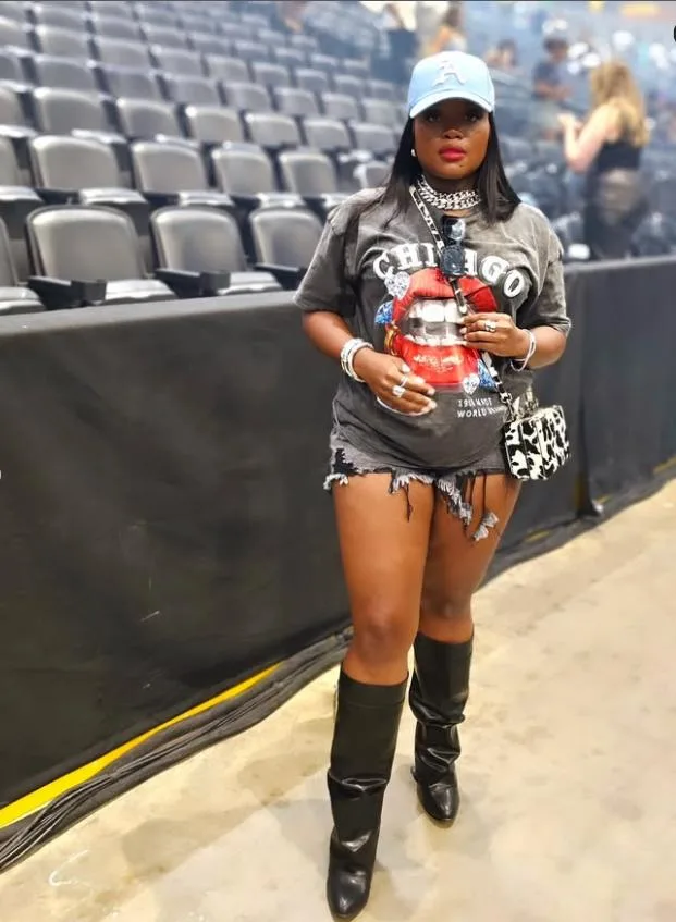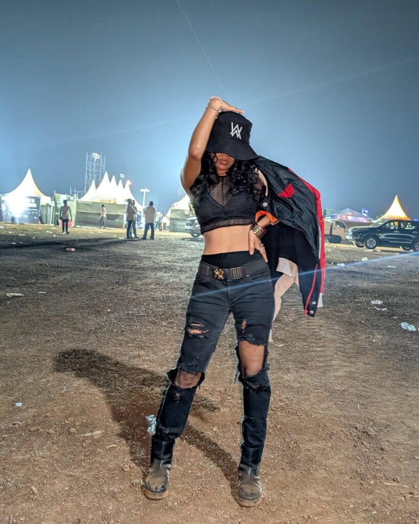 Knee-high black boots add sleek edge and elevate the casual look. Accessories like layered silver necklaces, chunky rings, and a cow-print mini bag add extra flair, while the sky-blue baseball cap keeps it laid-back. It’s a confident, fashion-forward look made for a night of music and attitude.