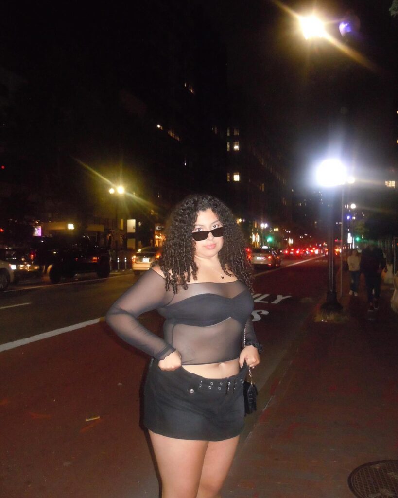 The black mini skirt features grommet details and a belted waist, adding structure and a touch of punk. Black sunglasses and a small handbag complete the look with attitude. This ensemble is perfect for making a bold statement under city lights, blending night-out glam with concert-ready energy.