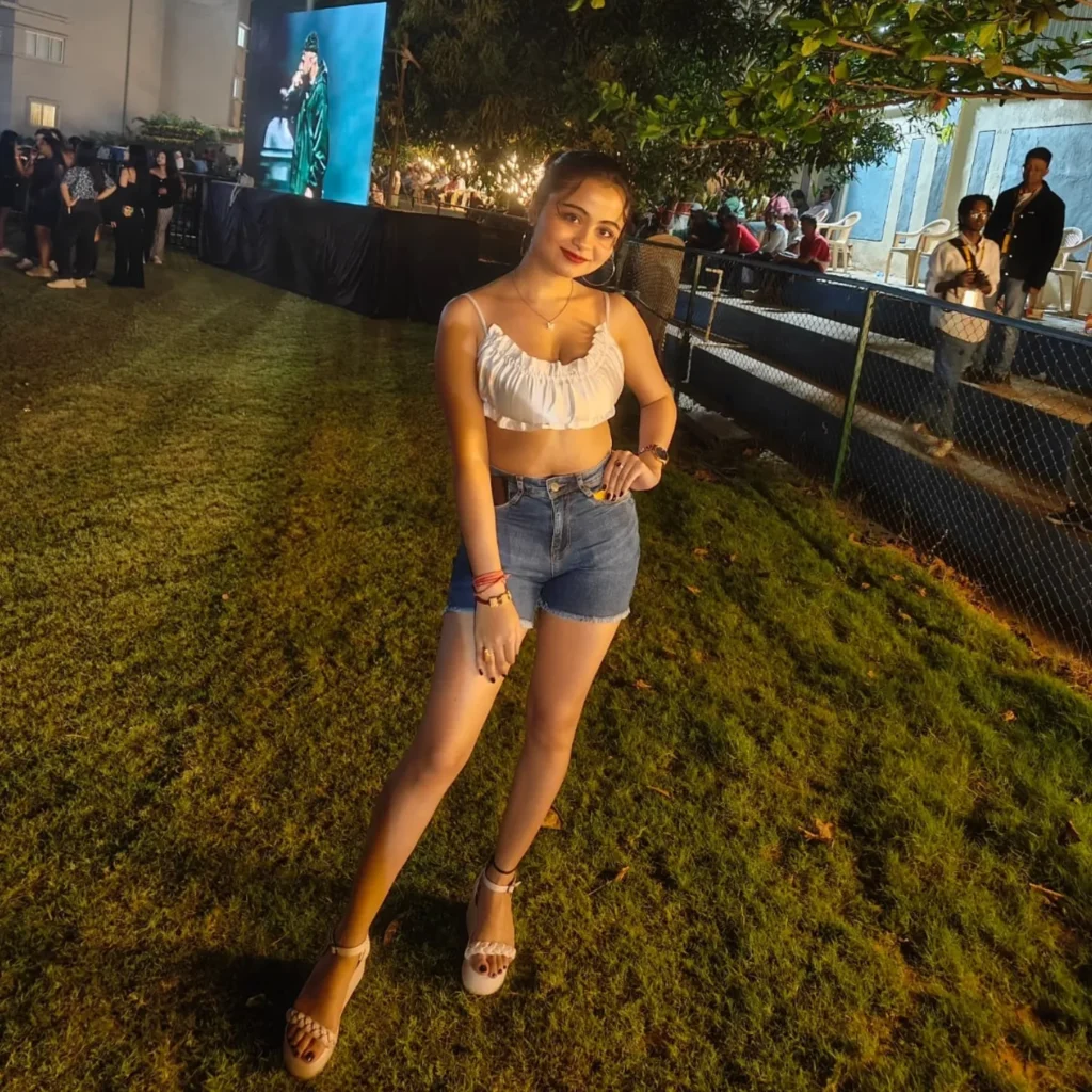 This night concert outfit keeps things breezy and flirty with a sweet white ruffled crop top featuring thin spaghetti straps. Paired with high-waisted denim shorts, it strikes a playful balance between casual and cute—perfect for dancing outdoors under the lights.