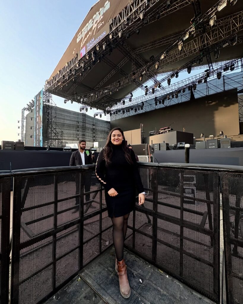Chunky white sneakers add a sporty twist while keeping the look practical for dancing or standing through long sets. Accessories like hoop earrings, a compact metallic shoulder bag, and oversized sunglasses on the head complete the trendy vibe. It’s a confident, stylish look made for those who love turning heads while staying grounded in comfort.