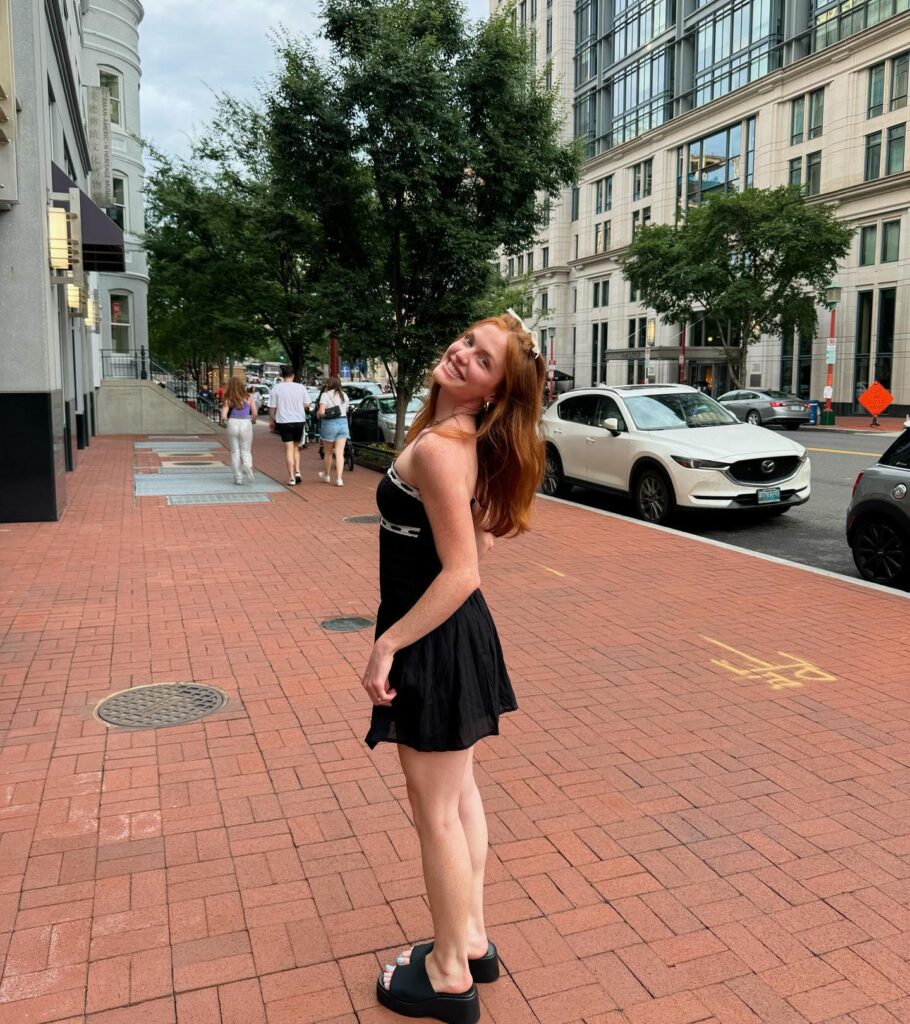 This night concert look is all about effortless charm. The strapless black mini dress features a playful flared hem and subtle printed detailing across the bust, offering just the right touch of personality. The lightweight fabric gives it a breezy, dance-ready feel.