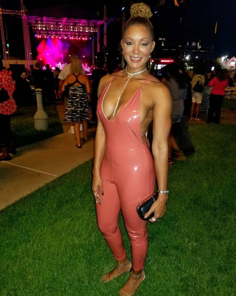 This show-stopping night concert outfit features a glossy, rose-toned latex jumpsuit that hugs every curve with confidence. The deep plunging neckline and open sides create a daring silhouette, while the fitted legs keep the look sleek and streamlined.