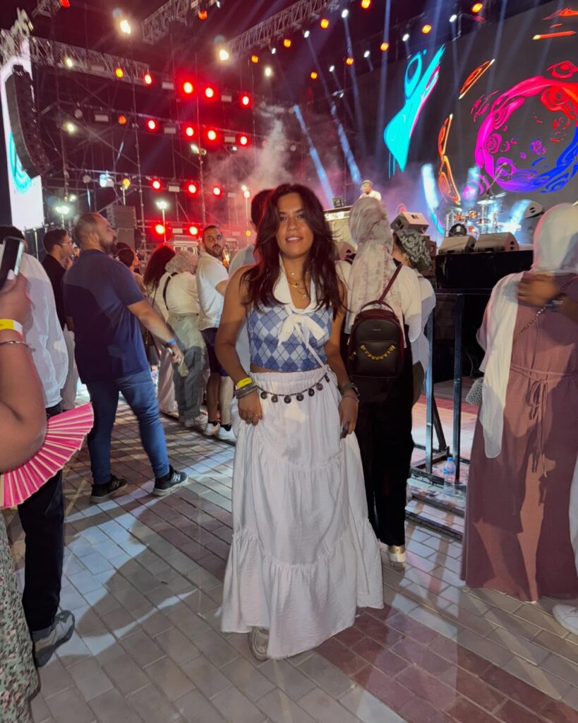This night concert outfit brings a sweet blend of preppy and boho styles. The blue and white argyle knit crop top features a crisp white collar and a front bow, giving off vintage prep-school vibes. It’s paired with a flowing white tiered maxi skirt that adds soft movement and a laid-back bohemian charm.