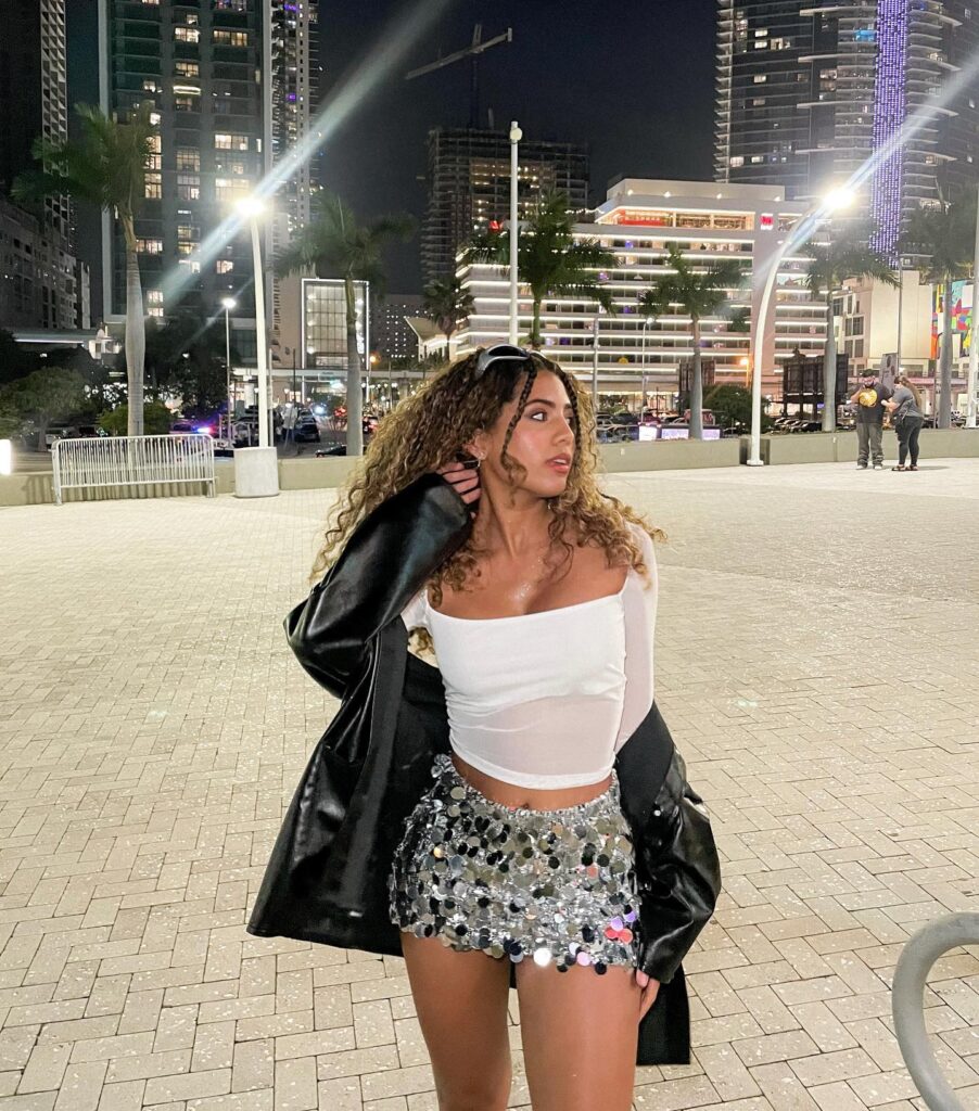 The addition of a sleek black leather jacket draped over the shoulders adds a cool, edgy vibe. With subtle accessories and natural curls completing the look, this outfit is perfect for making a dazzling entrance and standing out all night long.