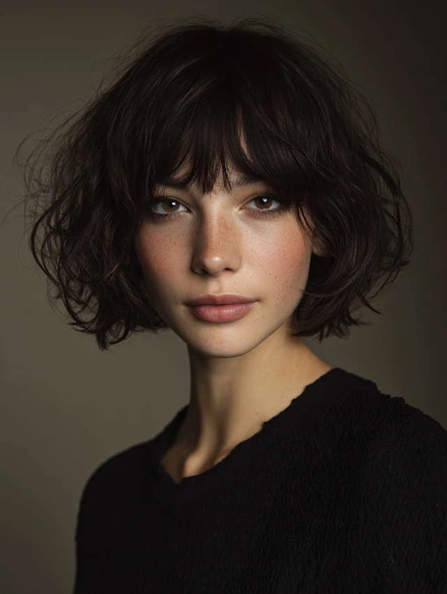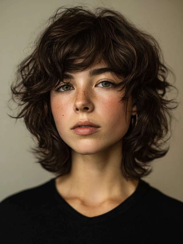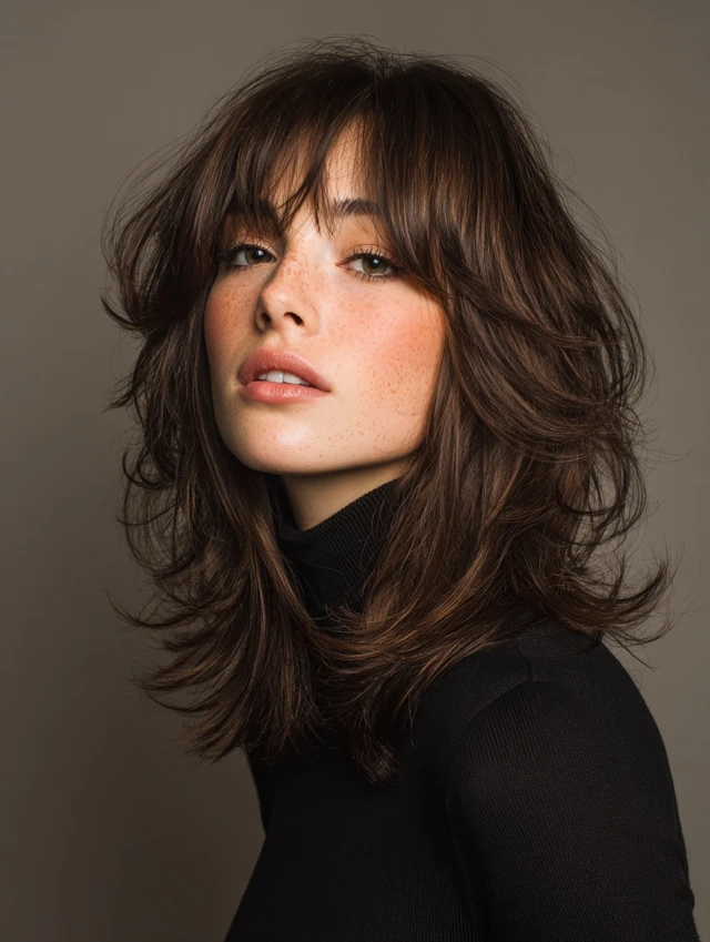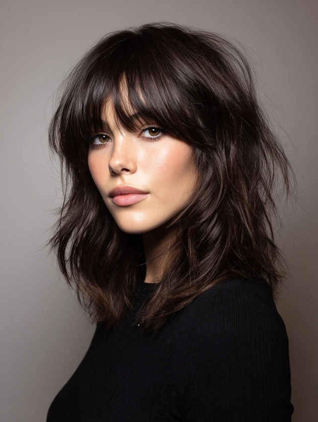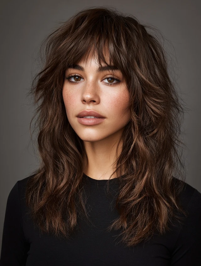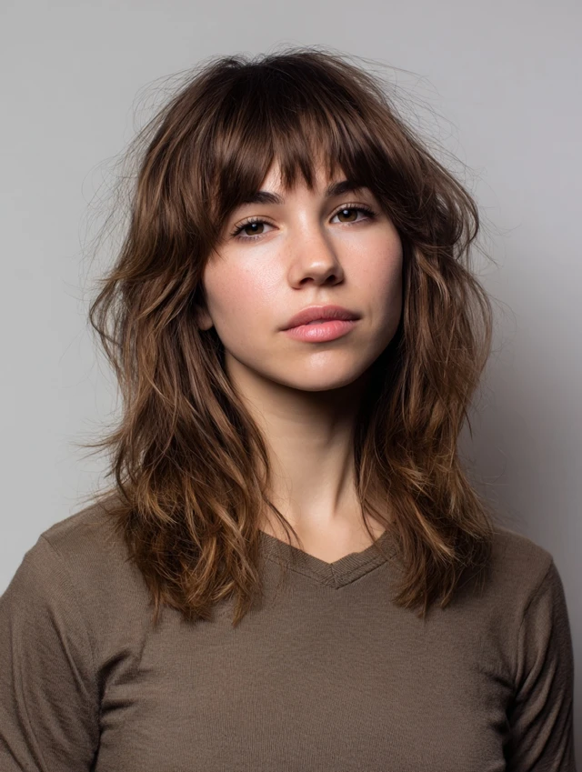 Adding wispy bangs softens the forehead and highlights the eyes. The choppy, layered texture blends bangs into the overall shape. Works well for round, oval, and heart-shaped faces. Straight, wavy, or slightly curly hair responds best.