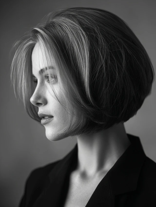 The inverted bob is slightly shorter at the back and longer at the front, creating a modern, refined angle. It works well for oval and round faces, adding structure and highlighting facial features.