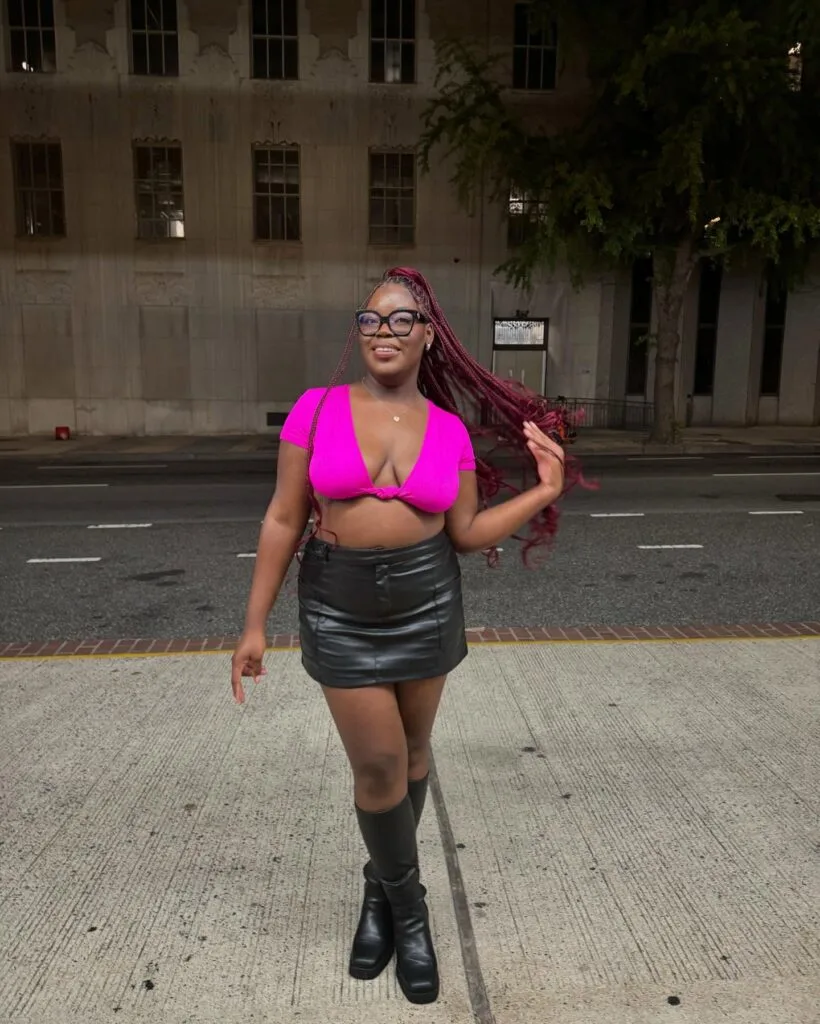 Layered over a long-sleeve pink top, the outfit feels playful yet bold. The heart chain belt and soft plush keychain add extra personality. Perfect for fans of Y2K and alt-girl vibes, this outfit is made to stand out in the crowd and radiate fun, flirty energy all night.