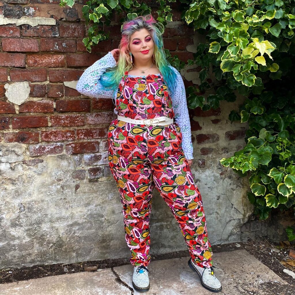 This playful outfit features a vibrant fruit print jumpsuit that brings pure joy and personality to the look. The colorful pattern pops with reds, greens, and yellows, while the belted waist adds flattering definition.