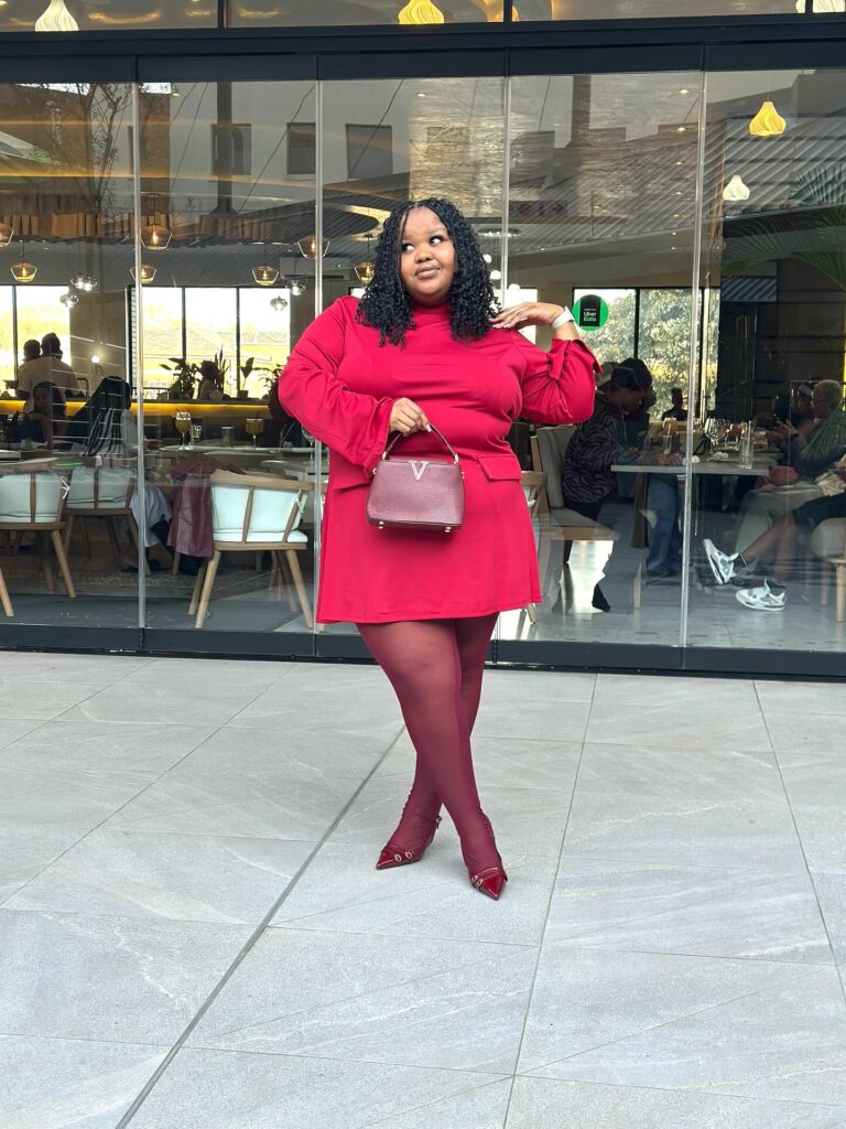 This outfit commands attention with a striking red mini dress that hugs the figure without feeling tight. The matching red tights create a seamless, elongated silhouette while adding depth and sophistication.