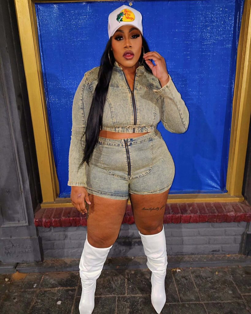 This edgy denim two-piece set serves serious baddie vibes. The cropped zip-up jacket adds a structured touch, while the matching high-waisted shorts flaunt curves with confidence.