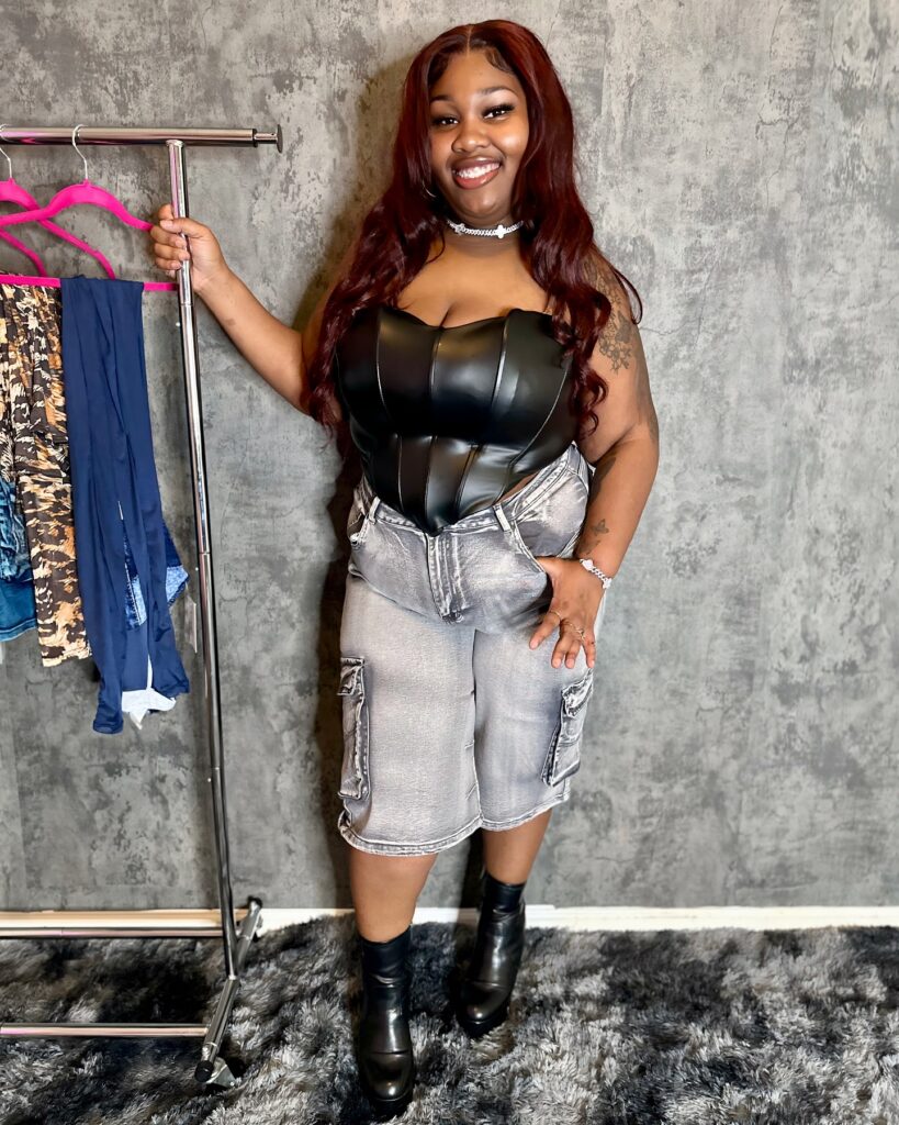 This edgy baddie look pairs a sleek black faux leather corset with gray acid-wash cargo Bermuda shorts. The structured top adds bold, sculpted definition, hugging curves and enhancing the waistline.