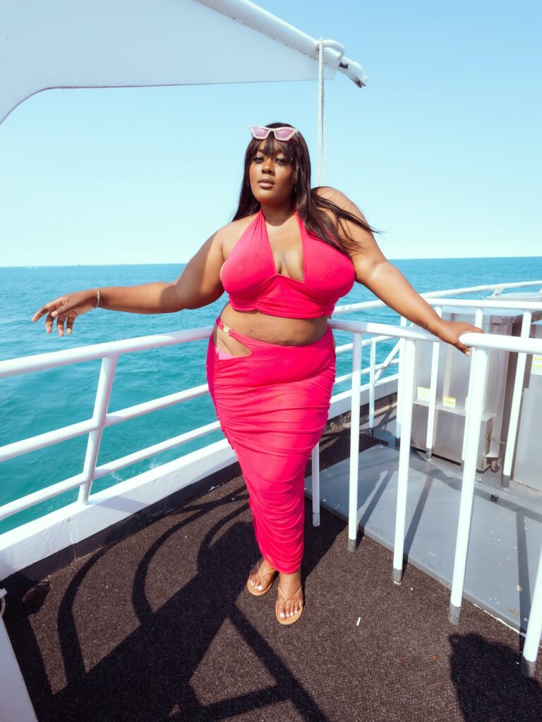 A side cutout with a gold accent adds extra spice to the look, making it both sexy and eye-catching. The hot pink hue pops beautifully against sunlit skin, perfect for boat days or tropical getaways. It’s an effortlessly bold outfit that brings main-character energy wherever you go.