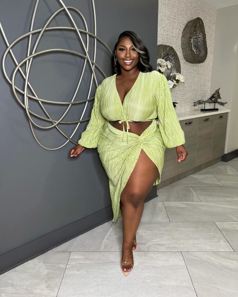 This lime green two-piece set is breezy, vibrant, and perfect for showing off curves in style. The long-sleeve crop top features a deep neckline with a center tie, creating a flattering frame.
