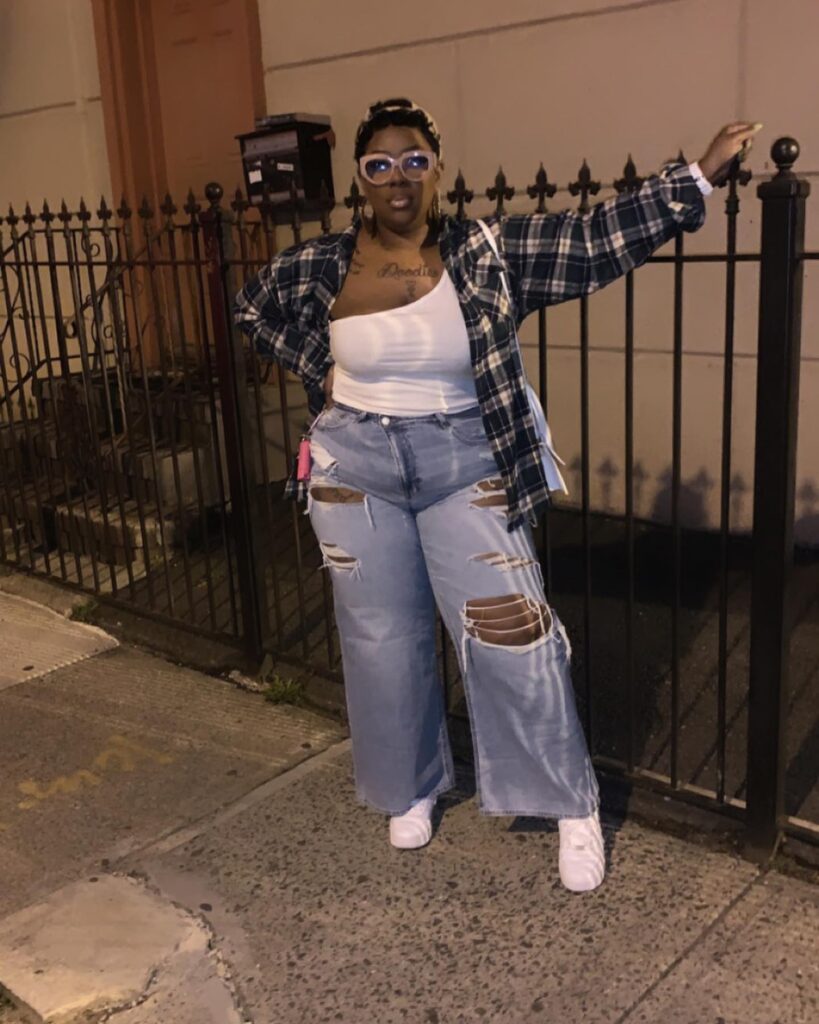 A navy plaid flannel shirt layers on top, bringing effortless cool and warmth. Finished with classic white sneakers, it’s the perfect outfit for nighttime hangs, weekend vibes, or lowkey flexes. Every piece works together to serve relaxed confidence with urban flair.