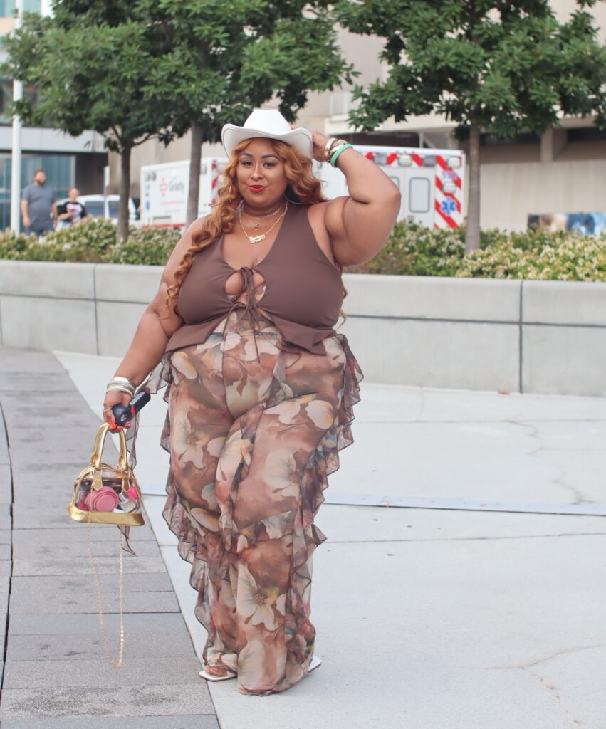 This look serves boho baddie realness with sheer, flowy floral pants that feel airy and romantic. The ruffle detailing down the sides adds movement and a soft feminine edge. Paired with a chocolate brown tie-front tank, the look stays grounded while highlighting curves with flair.
