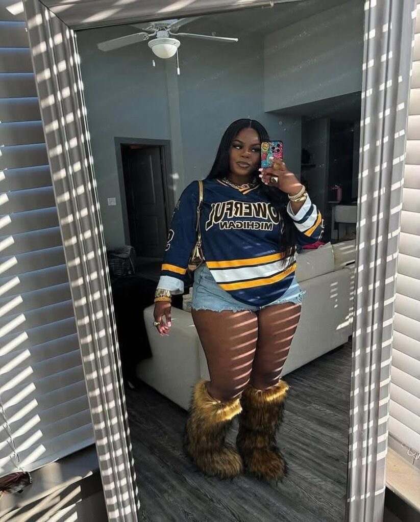What really steals the show are the knee-high fur boots, adding unexpected edge and drama to this casual combo. It’s a daring mix of cozy and streetwear, ideal for baddies who like to blend comfort with serious statement-making style. Perfect for chilly days with bold energy.