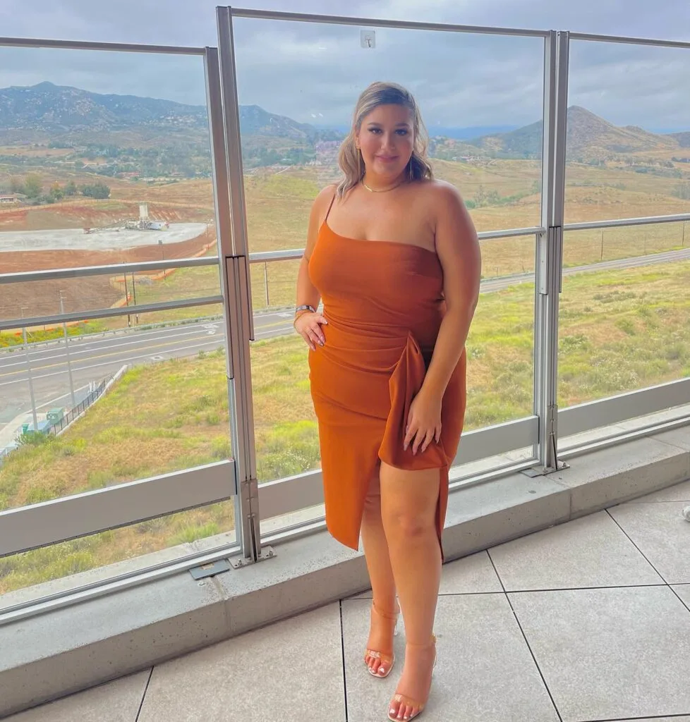 This birthday look is bold, refined, and perfect for celebrating in style. The rich amber-toned one-shoulder dress hugs the body in all the right places, highlighting curves with confidence. A gathered drape detail on the hip adds texture and drama, while the high slit reveals just the right amount of leg.